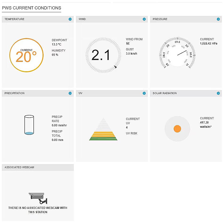 Other features - Obsługa globalnych publicznych platform meteorologicznych Weather Underground oraz Weathercloud Publikowanie danych z lokalnej stacji meteorologicznej na publicznych platformach meteorologicznych Obsługa urządzeń inteligentnych, dostęp do danych online oraz historii LCD Wyświetlacz z przekątną 5,4" (13,8 cm) Regulacja kontrastu wyświetlacza LCD umożliwiająca dostosowanie kąta widzenia Prognoza na 12 ~ 24 godzin oparta na zmianie ciśnienia i temperatury powietrza Ikona prognozy pogody (słonecznie, lekkie zachmurzenie, zachmurzenie, deszcz, burza, śnieg) Pomiar temperatury i wilgotności wewnętrznej ze wskaźnikiem komfortu Pomiar temperatury i wilgotności zewnętrznej Pomiar ciśnienia barometrycznego w wartościach absolutnych i względnych (hPa, inHg, mmHg) Zakres pomiarów temperatury wewnętrznej: -5 do 50°C Zakres pomiarów temperatury zewnętrznej: od -40°C do +60°C Zakres pomiarów wilgotności wewnętrznej: 20% do 90% RH Zakres pomiarów wilgotności zewnętrznej: 1% do 99% RH Wskaźnik temperatury odczuwalnej pod wpływem chłodnego wiatru, punktu rosy i indeksu ciepła Max./min. zapis w pamięci z oznaczeniem czas-data Protokół ostatnich 24 godzin Ustawienie alarmu Wysoka/Niska (wewnętrzna/zewnętrzna temperatura i wilgotność, prędkość wiatru oraz opady) Miganie wskaźnika przy aktywnym alarmie Wysoka/Niska Wyświetlanie czasu, kalendarza, dni w tygodniu i fazy księżyca Ostrzeżenie przed gołoledzią i poziom komfortu Porywy wiatru lub średnia prędkość wiatru (w mph, m/s, węzłach) Aktualnie dominujący kierunek wiatru Pomiar opadów deszczu przy pomocy ilości deszczu na dzień, tydzień, miesiąc (mm/in) Automatyczne ustawianie czasu i daty za pośrednictwem WiFi (opcja ustawienia ręcznego) Data i dzień tygodnia (dzień tygodnia w 7 językach: EN/IT/ES/DE/FR/NL/RU) Wyświetlanie temperatury w skali °C / °F 3 poziomy jasności wyświetlacza: wysoka / niska / automatyczne przyciemnianie Panel solarny do automatycznej regulacji jasności podświetlenia Umieszczenie na stole lub na ścianie Czujnik 5w1 jest częścią wyposażenia: Prędkość wiatru, kierunek wiatru, opady deszczowe, temperatura, wilgotność Transmisja na dużą odległość pomiędzy jednostką główną a czujnikiem aż do odległości 150 m (na otwartej przestrzeni) Obsługa do 7 czujników bezprzewodowych (SWS TH9898-9770-12500 - czujniki nie znajdują się w zestawie) Kalibracja danych pogodowych (za pomocą interfejsu użytkownika) Obsługa aktualizacji firmware Standard WiFi: 802.11 b/g/n, częstotliwość pracy WiFi: 2,4 GHz