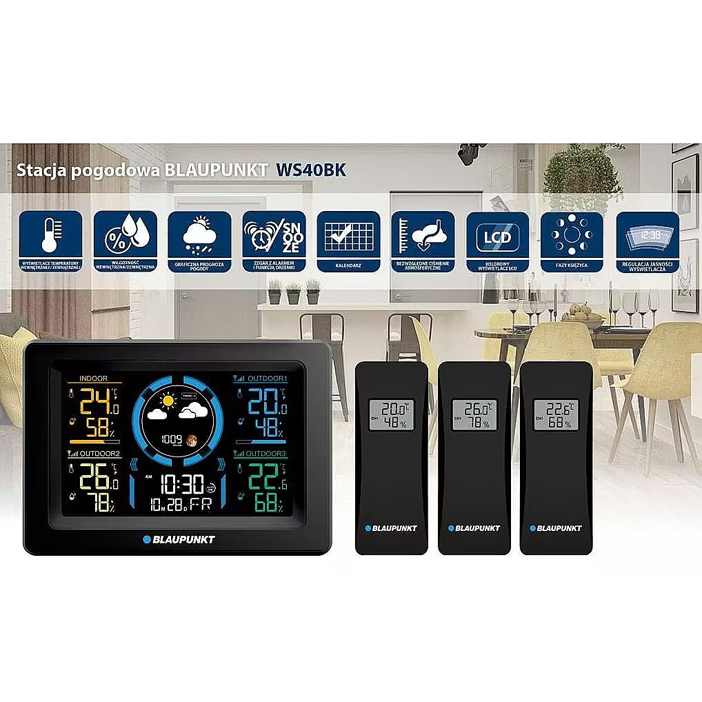 Description - WS40BK weather station Weather station with three wireless sensors for measuring temperature and humidity, absolute atmospheric pressure reading, temperature and humidity trend indicator, clock and calendar, alarm function, and display of moon phases. Powered by the supplied AC adapter or optional batteries. Climate under quadruple control! Thanks to the multifunctional display of the WS40BK weather station, you can control readings from four temperature and humidity sensors at the same time. One sensor is built into the weather station, the other three can be placed anywhere outside, in the bedroom or in the garage. Thanks to the LCD displays in the sensors, you can also read the data while being close to them. Thermometer and hygrometer always at hand! The Blaupunkt WS40BK weather station has a built-in sensor for measuring temperature and humidity inside the room in which it is installed. Three additional wireless sensors with LCD displays included in the set can perform measurements outdoors or in any selected location. Data regarding both temperature and humidity measurements are constantly updated and displayed on the LCD display built into the weather station*. Additionally, the device has a memory for measuring the lowest and highest values of both temperature and humidity, which reset automatically at the beginning of the next day. Temperature values can be displayed in either degrees Celsius or degrees Farenheit. Get to know the trends in your environment, including weather trends. In addition to reading temperature and humidity, trend indicators for these parameters are available. The arrows appearing on the screen indicate how the measured values have changed over the last hour. An up arrow means that a given parameter has increased its value, a down arrow indicates a decrease in the value of a given parameter, and a horizontal arrow means that a given value has not changed. You don't have to wait for the weather forecast, just take a look at our station! The display of the WS40BK weather station also provides a graphical weather forecast for the next 12-24 hours. Please remember that this forecast is calculated based on atmospheric pressure fluctuations and has limited accuracy, but it is a useful tool for estimating weather conditions for the next few hours in a specific place. Depending on the prevailing conditions, pictograms are available predicting sunny, partly cloudy, cloudy, rainy or snowy weather. The blood pressure is dropping, time for a cup of coffee! The WS40BK weather station has a built-in sensor for measuring absolute atmospheric pressure, and the reading data appears on the display. If you feel a sudden drop in energy or you are a meteorologist, just look at the display and if your blood pressure is low, it's a sign that you need to prepare a cup of coffee. Please note that this weather station reads absolute atmospheric pressure, which may differ from official weather forecasts. The reason for this difference is that the relative pressure given in official weather forecasts is reduced to sea level. The absolute pressure indicated in this model is the pressure measured at a given location at the appropriate height. Turn up the parameters! The WS40BK weather station has been carefully calibrated in our production plant, and the weather forecast will calibrate automatically during the first two weeks of use. However, if you want to manually adjust it, you can do so during the initial setup. What time is it, what day is it? There is also a clock on the LCD screen that can display the current time in both 12- and 24-hour formats. Thanks to this, the station also functions as a useful watch. Next to the clock, there is also a calendar that will inform you what day of the month it is and what day of the week it is. The names of the days of the week are available in seven languages (DE, EN, FR, IT, SP, DU and DA) and can be changed when setting the calendar. Hello! Incentive! The WS40BK weather station also has an alarm function, so if you need to get up earlier, simply set the time you want the alarm to go off and sleep soundly. The alarm will go off automatically, and if you want to sleep a little longer, turn on the snooze function and the alarm will go off again in 5 minutes. The alarm is triggered by a sound signal that lasts for 2 minutes, long enough to wake up even the heaviest sleepyhead. You can also use the alarm not only to wake up, but also as a reminder of some important events during the day that you don't want to miss. LCD display! Are you going dark? Of course I'm missing the point. The display of the WS40BK weather station has a dimming function and no, it does not cheat, it only changesbrightness of the backlight and, importantly, it does not do it alone. You decide when to dim the display to make it less distracting or more visible. Additionally, it has the function of automatically programming when the display should darken and brighten. You simply set the time you usually go to bed and get up, and the display will dim and brighten accordingly so as not to disturb your sleep. Isn't it useful? Power supply. You can connect the WS40BK weather station to the socket using the supplied 5 V 1200 mA power supply, and the wireless outdoor sensors each with two AA batteries, which are included in the set, a total of 6 pieces. In order for the station to remember the settings during a power outage, you need to buy 3 batteries. AA and install them in the compartment located on the back wall of the housing! The station can operate without these batteries, but after a power outage you will have to make the appropriate settings again. These optional batteries can also serve as an alternative power source if you take the station to a plot where you do not have access to electricity. When running on battery power, the display will automatically turn off to save battery power. Additionally, the LCD screen provides battery level indicators for all 