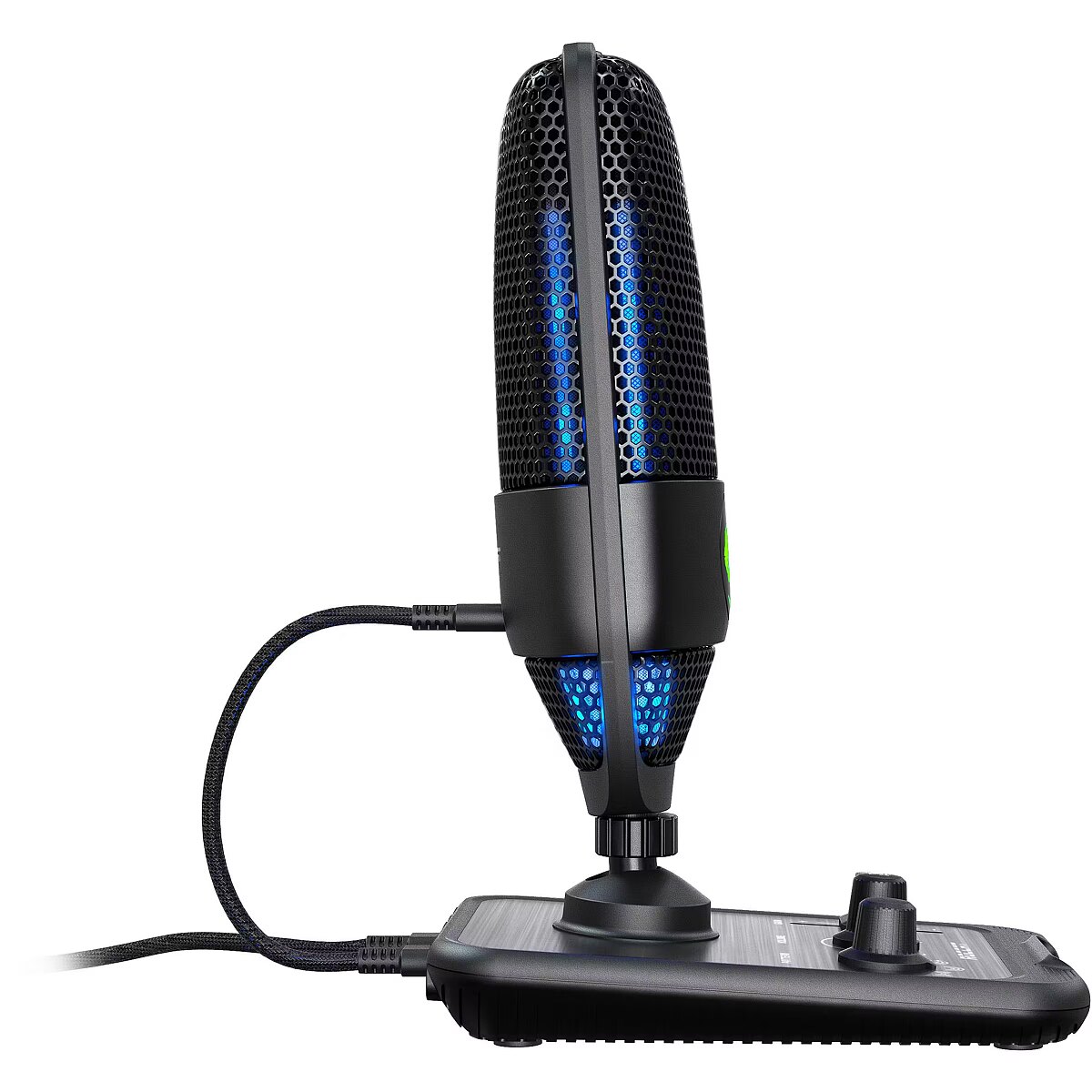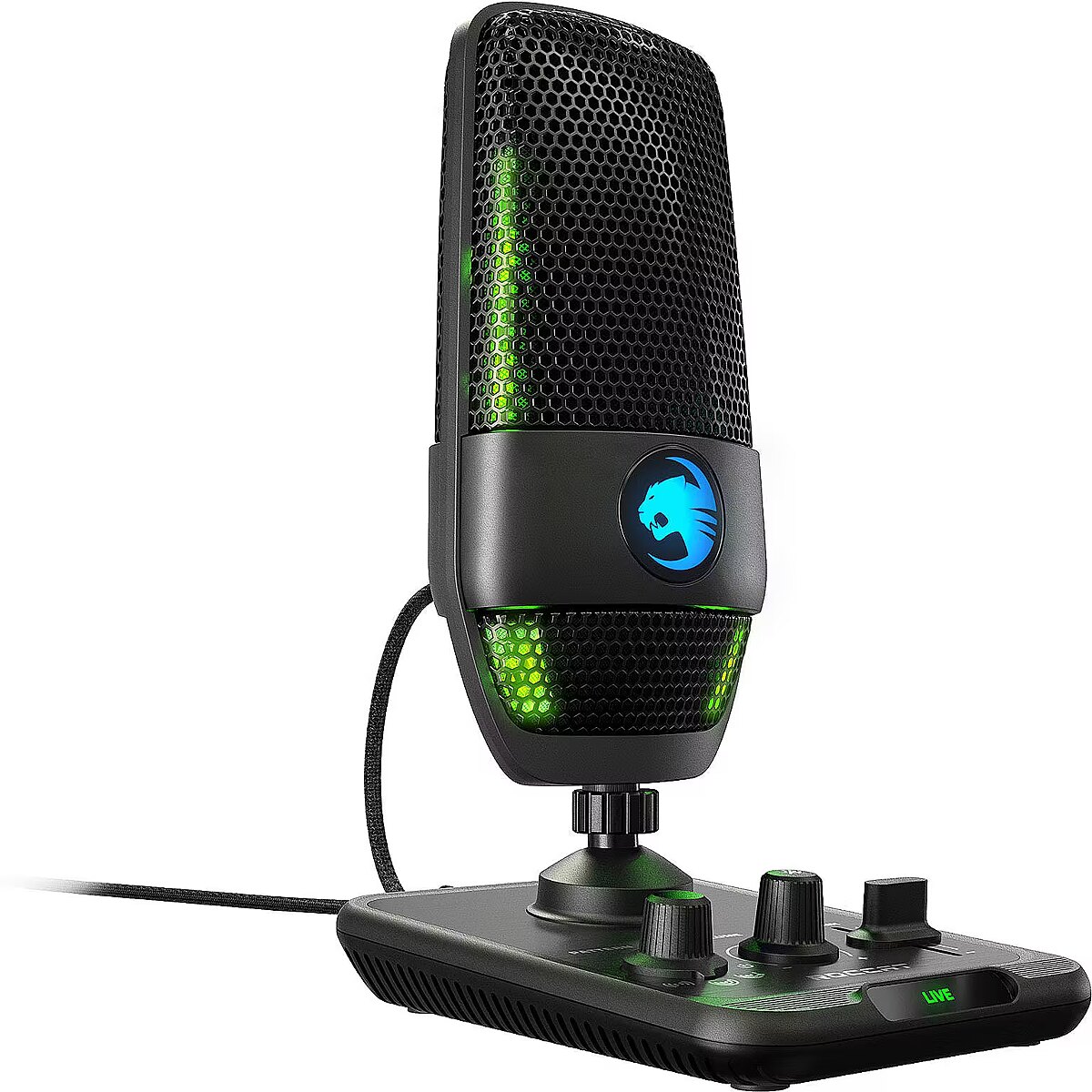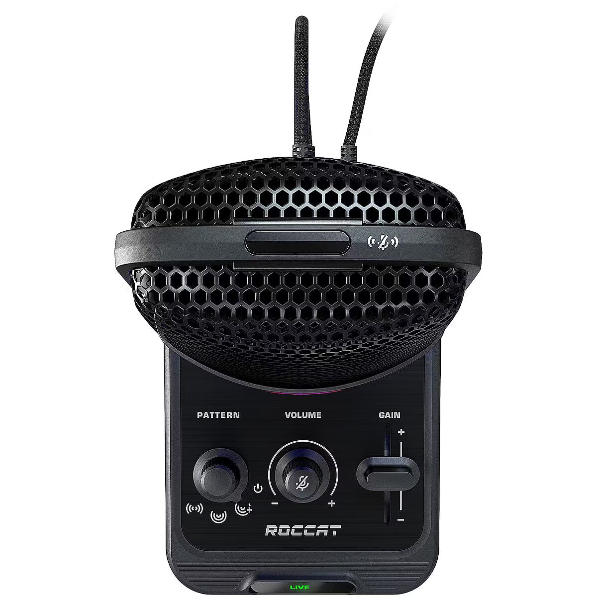 LongDesc - LIGHT YOUR WAYMeet the ROCCAT® Torch™ Studio-Grade USB Microphone. The dual condenser design and 24-Bit audio quality will take your content to the next level. Cardioid, Stereo and exclusive Whisper pick-up patterns give you the tools to create anywhere. Contactless Quick Mute grants instant control. Boom arm compatibility means the Torch evolves with you.STUDIO-GRADE AUDIOFeaturing a dual condenser design, 24-Bit audio with up to 48kHz sampling, you’ll have all the tools you need to refine your audio and sound your best. Your quietest whisper to your loudest roar – all delivered crisply and clearly.MIXER-STYLE CONTROLSCycle pick-up pattern or adjust volume and gain on the fly with professional mixer-style controls, allowing you to fine-tune your setting with ease. Includes a 3.5mm headphone jack for latency free Mic Monitoring, ensuring you always sound the way you want.CONTACTLESS QUICK-MUTEFor lightning-fast control, the gesture activated mute functionality provides a convenient way to instantly mute without disturbing your audio quality. The RGB lighting and handy indicator on the base clearly show when you are muted, or live. You can even adjust the gesture detection distance on the rear of the base.REACTIVE LIGHTING WITH AIMOThe 3 distinct RGB lighting zones change color depending on the pattern selected or mode the Torch is in. The light bars on the sides also act as a visual indicator helping you set your gain, moving up and down as you fine-tune to perfection.DRIVER-FREE SETUPFrustration free plug and play set-up. You don’t need any additional drivers or complicated software. You have everything you need to get started right out of the box. Just you, your PC and the Torch.BOOM ARM COMPATIBLEThe Torch adapts to your needs and grows with your setup. Fully compatible with a wide array of boom arms, it can be reconfigured, allowing the mic module to sit on the arm, whilst maintaining the full functionality of the mixer-style base.THREE SELECTABLE PICK-UP PATTERNSEverything you need to game, create or broadcast in any setting.