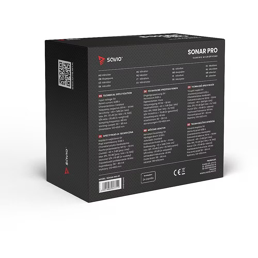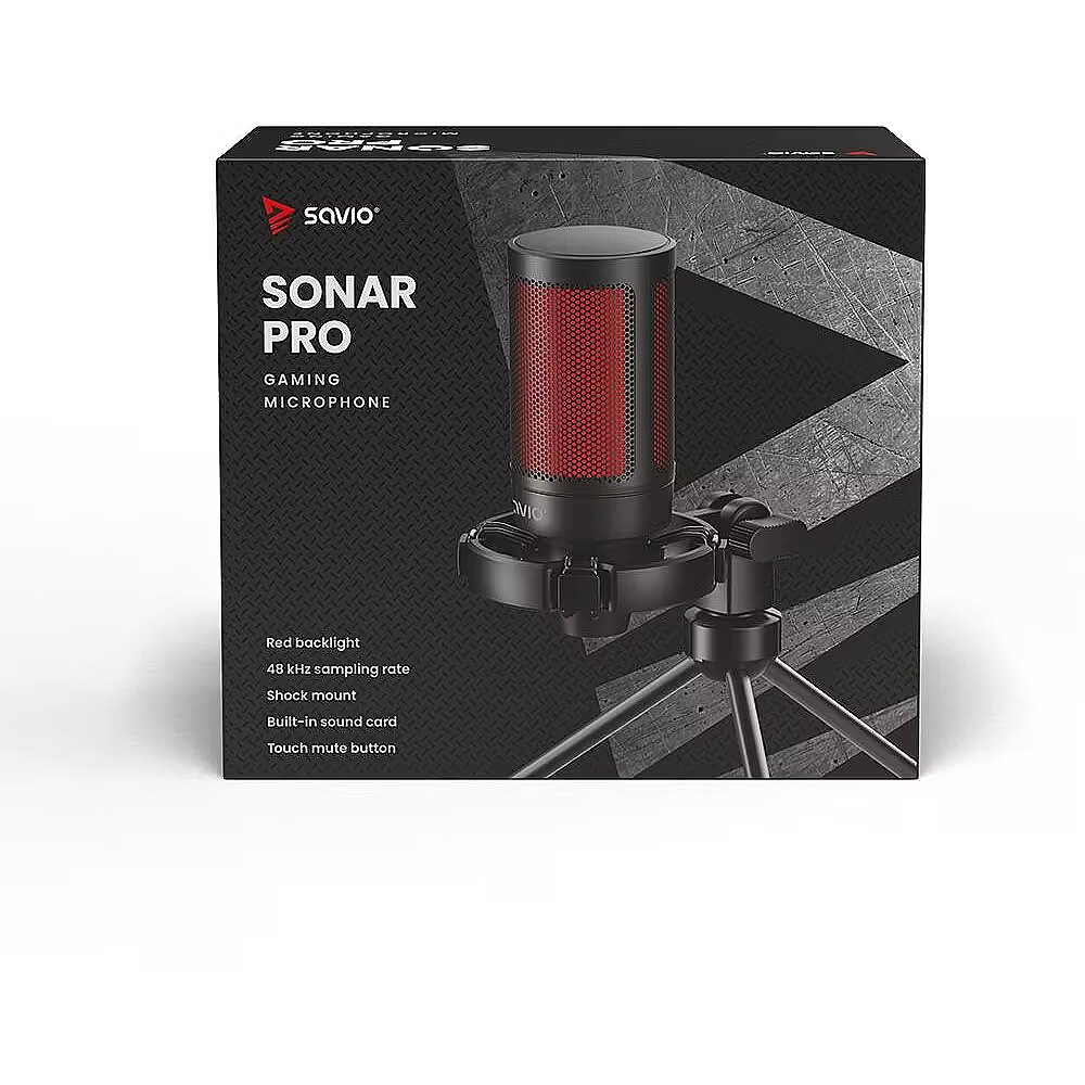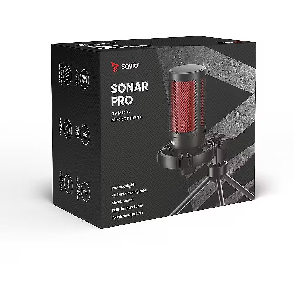 LargeDescHTML - The SONAR PRO gaming microphone is the ideal equipment for recording sound. It has a built-in pop filter to prevent sound distortion and an anti-shock cage protecting against recording accidental impacts on a desk or tabletop. A convenient on/off button on the microphone gives you control of the unit without having to unplug it from your computer or console. In addition, the built-in soundcard and cardioid microphone characteristics make it ideal for streamers, online gamers, or podcasters. What’s more, it is a plug & play device. It works as soon as you connect it into a computer or a laptop. In addition, the 1.8m USB cable ensures convenience and comfort.BUILT-IN POP FILTERThe Savio SONAR PRO microphone has a built-in pop filter to prevent distortion of sound recordings caused by the utterance of explosive voices and to protect the microphone from saliva build-up.ANTI-SHOCK BASKETThe gameplay of our favourite titles can sometimes be very exciting. That’s why, the anti-shock basket is an essential addition to any microphone. Beacaouse of this, the microphone will not pick up unwanted vibrations on the recording. Even with loud mouse movements or bumping your hand against the tabletop, and will only record clear sound.THE TOUCH MUTE BUTTON IS AN ADDITIONAL ADVANTAGE OF THE GAMING MICROPHONE SONAR PROA button on the bottom of the unit will allow you to quickly and conveniently pause or return to recording without entering the microphone’s system settings or unplug it from the USB port.SONAR PRO GAMING MICROPHONE HAS HIGH-QUALITY RECORDINGWe have created a microphone that guarantees unprecedented depth of recorded sound using the highest quality components. The microphone offers sampling rates of up to 48 kHz, and an additional built-in sound card is responsible for the sound quality. In addition, we have used a cardioid characteristic for the microphone. Therefore, the microphone is perfect for streaming your favourite games and recording podcasts or conversations with friends.RED ILLUMINATION Due to its gaming design, the Savio SONAR PRO microphone is perfect for gamers. For this reason, we equipped it with a special and stylish red backlighting. Because of this, the backlighting will generate unique atmosphere in your room and inform you when the device is working or muted.USB CONNECTIONThe microphone features a detachable 1.8 m long USB-C – USB-A cable. You can connect the microphone to your computer or console without any problems. In addition, the Plug and Play function guarantees express hardware installation without downloading drivers from the manufacturer’s website. Thus, you only need to connect the device to enjoy all its functions after just a few moments. PACKAGE CONTENTS:Savio microphoneAnti-shock basketTripodUSB-C cableUser manual