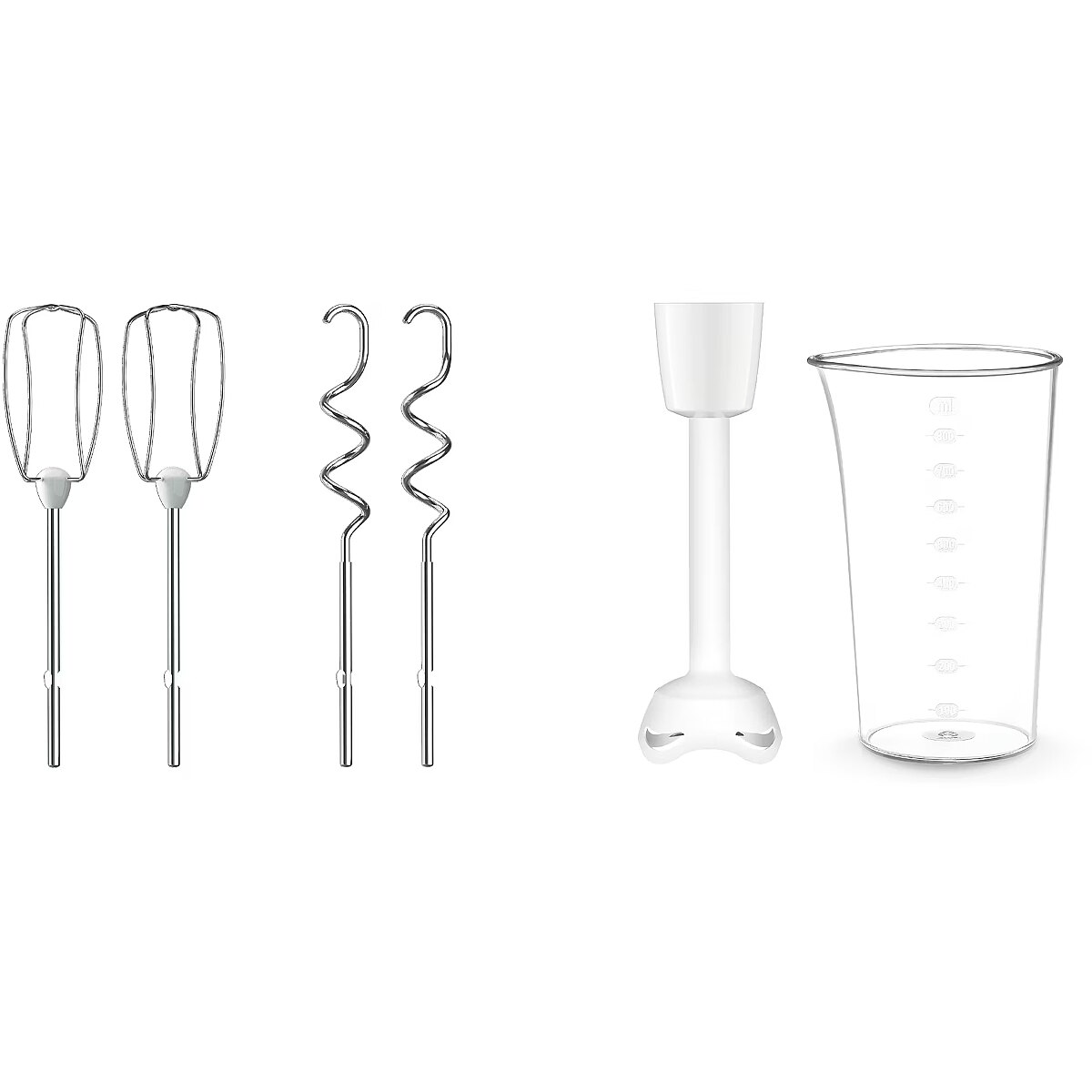 MediumDescription EN - • Powerful 500 W motor • 5 speeds + turbo function • 2 whisks, 2 dough hooks, plastic hand blender attachment, measuring beaker