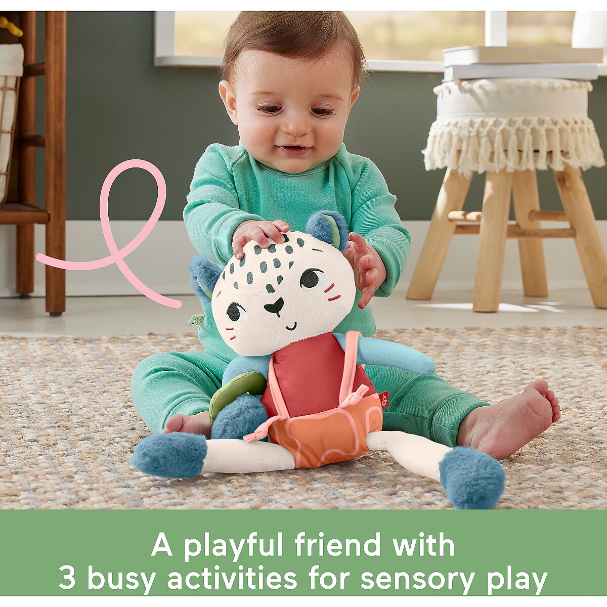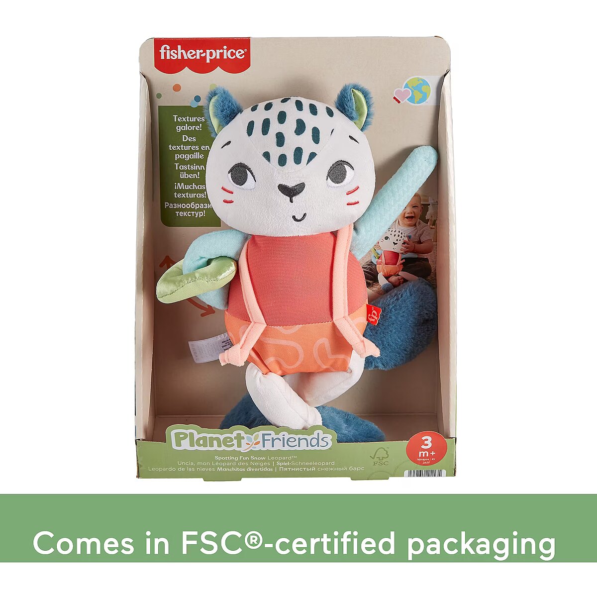 LongDesc - Inspired by animals that are endangered or vulnerable, the Planet Friends Spotting Fun Snow Leopard baby sensory toy from Fisher-Price uses fabric made 95% post-consumer recycled plastics and comes in packaging made with FSC-certified paper to support responsible forestry. This plush toy features satiny fabrics, soft fuzzy crinkle boots and high-contrast colours to engage your baby’s senses. Fun fine motor activities include pull-through legs, a slide-off suspender and a soft sliding arm ring for your little one to discover. This toy can also help provide a sense of security for your baby at home or when traveling and is machine washable. (FSC C172210, 2021)