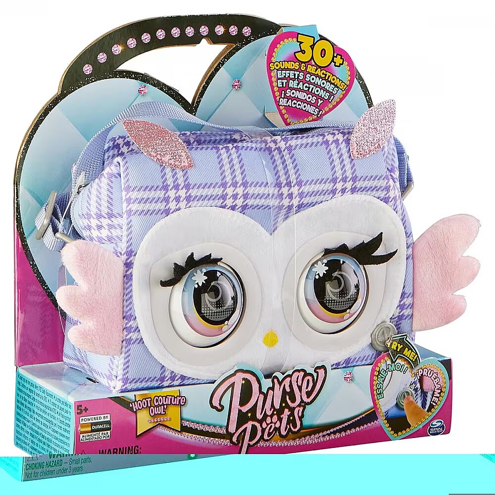 LongDesc - Discover Print Perfect Purse Pets with patterned fabrics! These fashionable and fabulous interactive Purse Pets (perfect girls gifts) are packed with purse-onality. They respond to your touch, really blink and have over 30 new exciting sounds and reactions! Hoot Couture Owl features lilac plaid fabric, glittery ears, plush wings, pop-art inspired eyes and an adjustable strap. When you’re out and on-the-go, your Hoot Couture Owl Purse Pet will blink and make sassy sounds as she interacts with you. She loves to cuddle! Hug her tight and you’ll hear the sweetest snuggling sounds. Then, check out the stylish insignia on the front of your purple purse – it’s a secret button that unlocks more ways to play! In Magic Mode, you can play games and strike a pose! Want to know how much your Purse Pet likes your outfit? Try the style meter with BFF Realness Mode! Ask her what she thinks, touch her forehead, and she’ll respond. The louder the applause, the more she loves it! In Runway Ready Remix, your Purse Pet will play cool fashion show-inspired music while you strut your stuff and rock your runway look. Play the role of DJ and remix the beats by tapping her forehead – she even makes record scratch sounds! Dance to the music and strike a pose for the cameras when the music stops in Fashion Freeze. It’s so much fun! Plus, with the Bamboo Boo Koala Purse Pet (sold separately), these trendy toys can sing a secret song together when you time it just right. With Purse Pets, friendship meets fashion! Take your super cute purse with you everywhere you go. Measuring approximately 4.25 in. (H) x 6.25 in. (W) x 2.5 in. (D), each Print Perfect Purse Pet fits all your essentials. Includes 3 AAA Duracell batteries. Purse Pets interactive toys for kids are great birthday gifts, Christmas gifts, stocking stuffers or gifts for any occasion. Collect them all (each sold separately) and express your style! Bring your look to life with the Print Perfect Hoot Couture Owl Purse Pet!Includes: 1 Purse Pets Purse, 1 Instruction Sheet