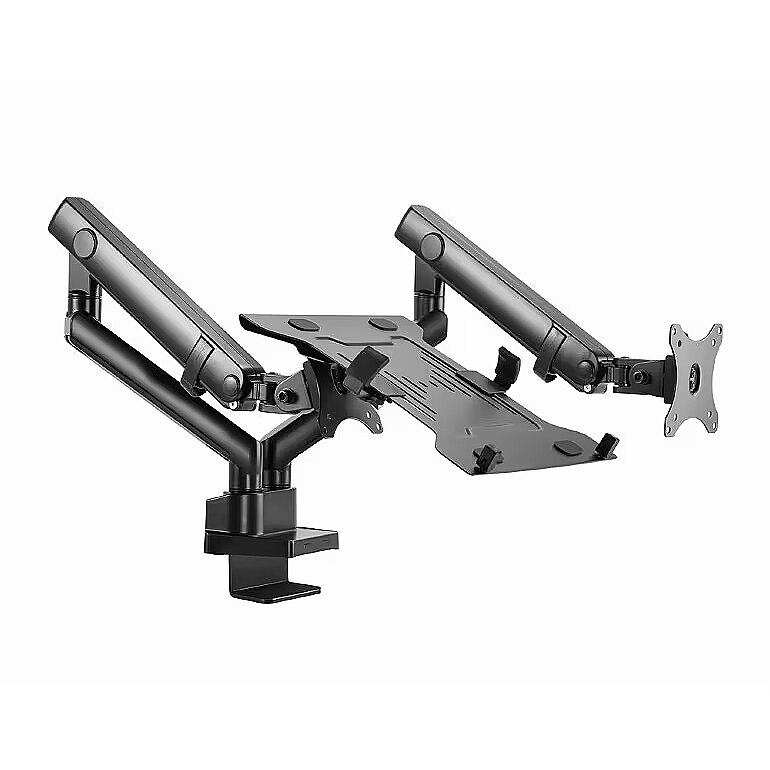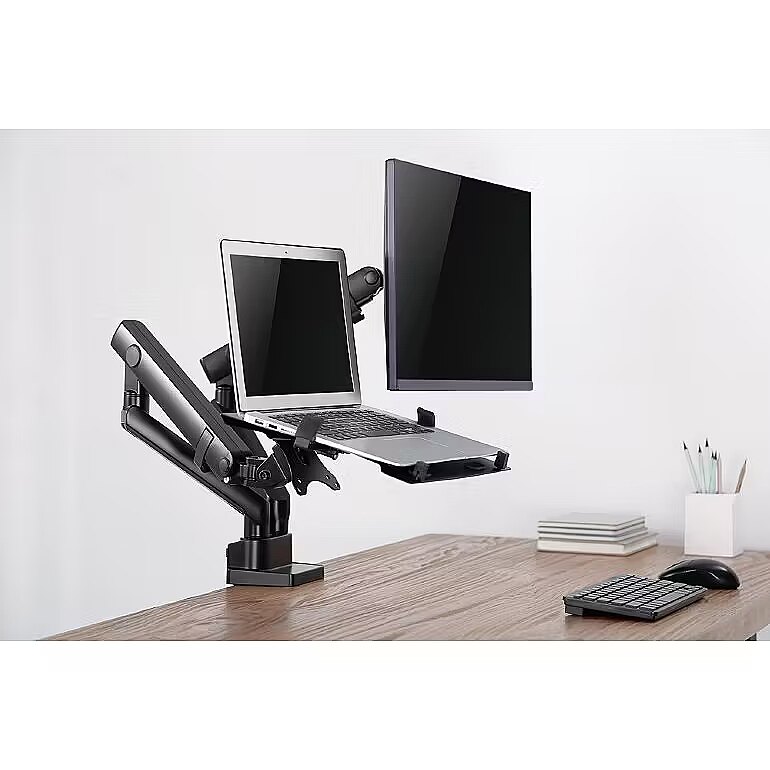 Description - Adjustable Desk Mount Monitor Arm with Notebook Tray (Full Motion) Set your screen perfectly Lightweight design for full movement Desk-mounted monitor holder with notebook shelf The arms swivel, extend and retract, tilt to change reading angles, and allow displays to be rotated from landscape to portrait mode, etc. Allows easy, ergonomic positioning to reduce workload Works with almost any LCD monitor (max. 32") and supports notebooks up to 15.6" Durable, adjustable spring arms, suitable for monitors weighing 18 kg Strong desk clamp or grommet for easy and secure attachment to your desk