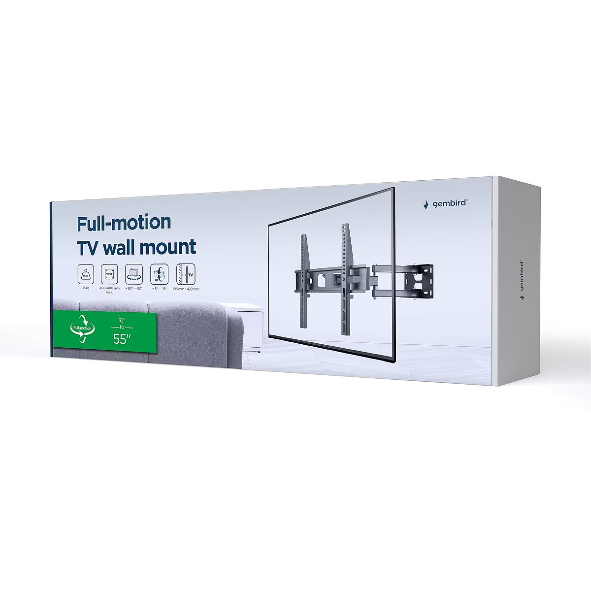 Summary - Gembird WM-55ST-03. Maximum weight capacity: 35 kg, Minimum screen size: 81.3 cm (32"), Maximum screen size: 139.7 cm (55"), Minimum VESA mount: 75 x 75 mm, Maximum VESA mount: 400 x 400 mm. Tilt angle range: 5 - -18°, Swivel angle range: 90 - -90°, Distance to the wall (min): 10.5 cm, Distance to the wall (max): 42.9 cm. Product colour: Black