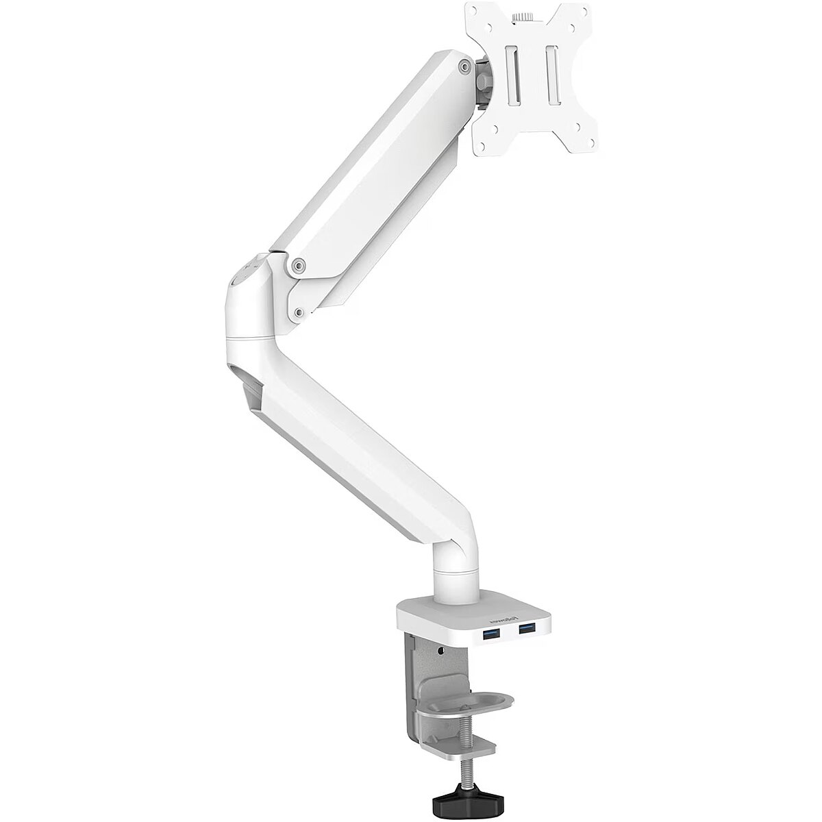 Description - Platinum Series Single Monitor Arm - Silver Elevate your monitor to increase valuable desk space and reduce eye, neck and shoulder strain. Effortlessly and flexibly move your monitor with gas spring technology. Built-in dual USB connectivity for convenient access to your devices. Intuitive cable management system to keep you tangle free. Desk clamp and grommet mount included for secure and easy attachment options. Tested by FIRA International Ltd to comply with the ergonomic requirements set out in the European Health and Safety Legislation: EN ISO 9241-5.