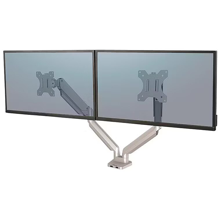 Title - Fellowes Platinum Series Dual Monitor Arm - Monitor Mount for Two 8KG 40 Inch Screens - Adjustable Dual Monitor Desk Mount - Tilt 45° Pan 180ᵒ Swivel 360ᵒ Rotation 360ᵒ, VESA 75 x 75/100 x 100 - Silver