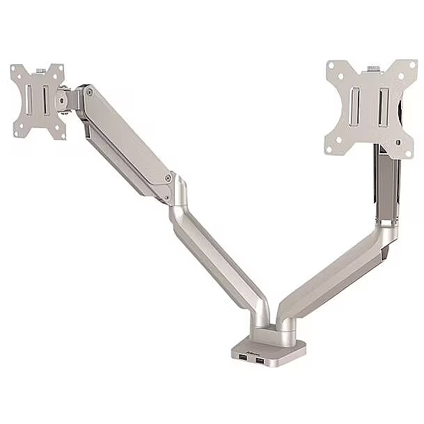 LongDesc - Sitting or standing with bad posture all day using a computer is bad for your health. Leaning forwards or tilting your head up or down not only causes back and neck strain but is also bad for your eyes. Fellowes Platinum Series monitor stands will improve your ergonomic posture and reduce back neck and eye strain. With ever shrinking office spaces, using monitors stands means you can free up valuable work space to become more organised and productive. With effortless adjustment you can collaborate and share information with colleagues easily, making them perfect for hot desks or shared desks. This fully independent adjustable monitor stand by Fellowes can pan 180°, tilt +/-45° (90°) and can rotate 360° via innovative gas spring technology allowing for effortless movement. Built in dual USB connectivity and intuitive cable management allows you to stay connected and minimise clutter at the same time with the Fellowes Platinum Series monitor mount. Easily mounted via clamp or grommet, each arm holds a monitor up to 8kg (up to 40" monitors) and meets VESA monitor bracket standards.