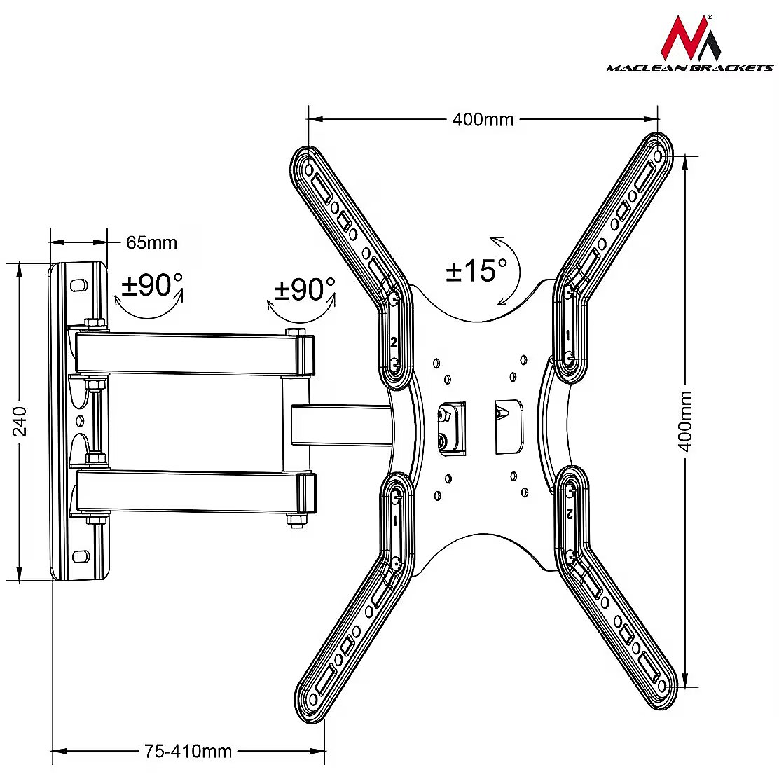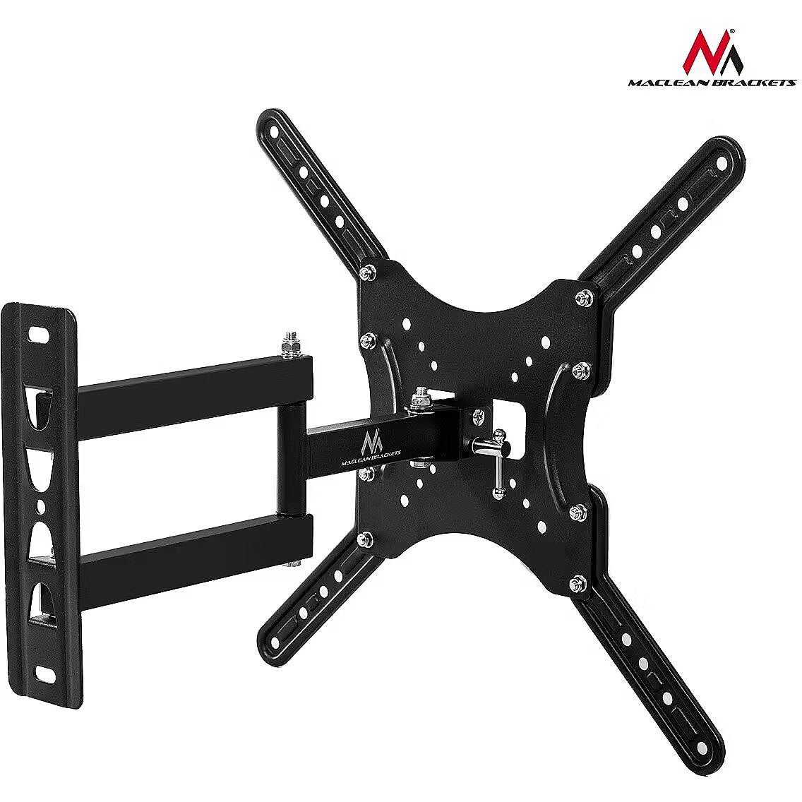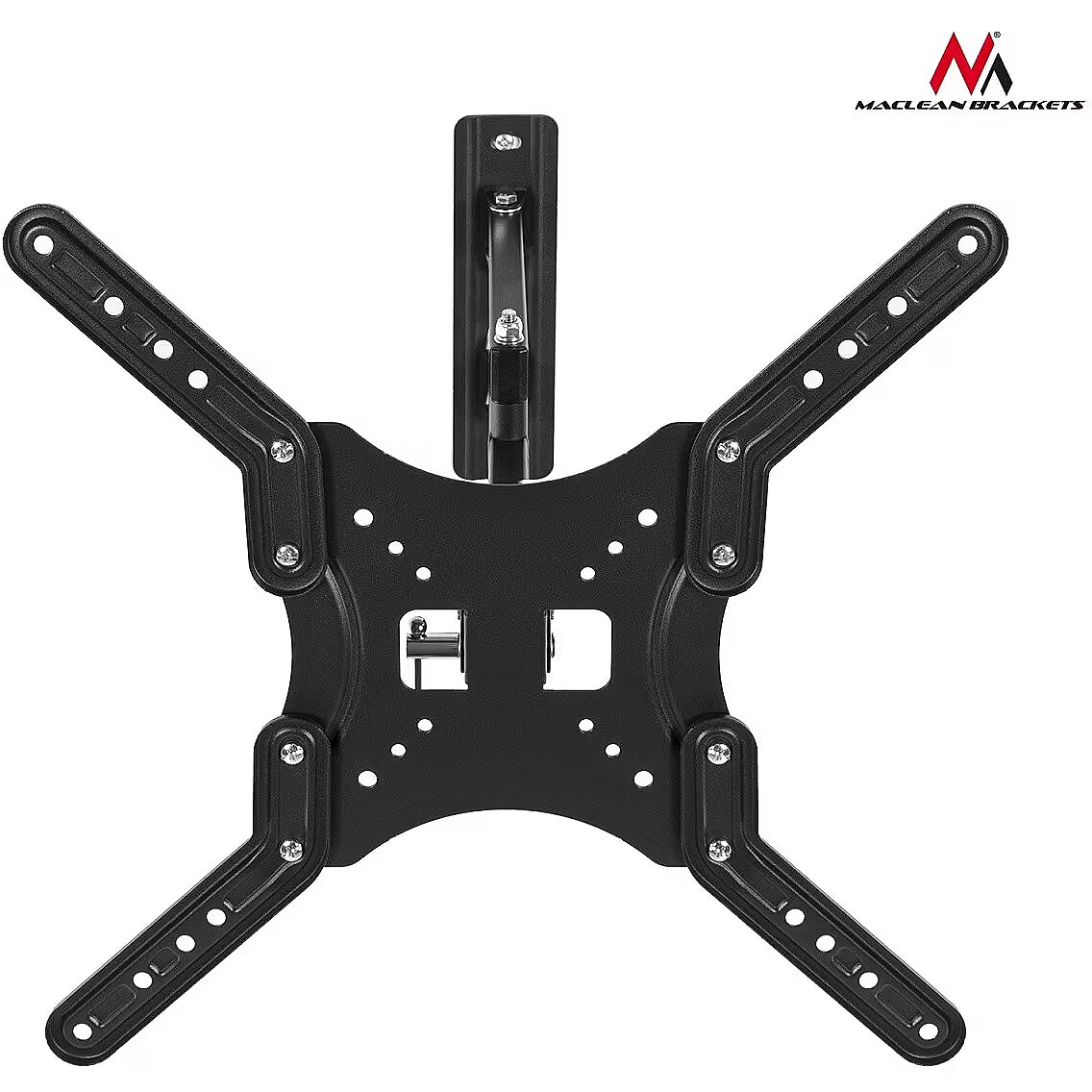 Description - Enjoy one of the best brackets of the Maclean brand offering easy adjustment and installation with strong design and multi-function operation. The MC-761 is compatible with almost all TVs and monitors LED, LCD and plasma: Sony, LG, Samsung, Philips, Sharp, Panasonic, Toshiba, Grundig, Pioneer, JVC, Benq, Sanyo, NEC, Hyundai, Hitachi, from 13" to 55", with a weight of up to 30kg. The holder is safe for all brands with VESA standard 75x75, 100x100, 200x100, 200x200, 400x200, 400x400. The standard VESA is only a suggestion - you can mount a larger TV on the mount if it does not exceed the maximum weight and fit in a similar VESA standard. Another contemporary feature is adjustment of bracket - rotation of up to 90 degrees either to the left or to the right and from -15 to +15 degrees of inclination. You can also adjust the wall distance from 75 to 425 mm. - Maximum load: up to 30kg - The degree of inclination: from -15° to +15° - Minimum / maximum horizontal spacing: 75/400 mm - Minimum / Maximum vertical spacing: 75/400 mm - Distance from the wall: from 75mm to 410mm - Solid metal construction, very easy assembly - Designed for TVs: from 13 "to 60" (or larger if their weight does not exceed 30kg and the VESA standard is compatible with the bracket) - Includes: a set of mounting screws for the wall and for screwing the TV - VESA: 75x75, 100x100, 200x100, 200x200, 400x200, 400x400