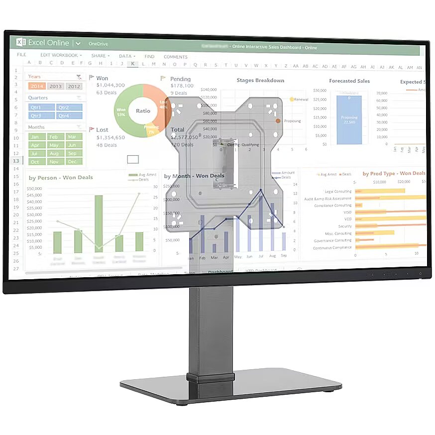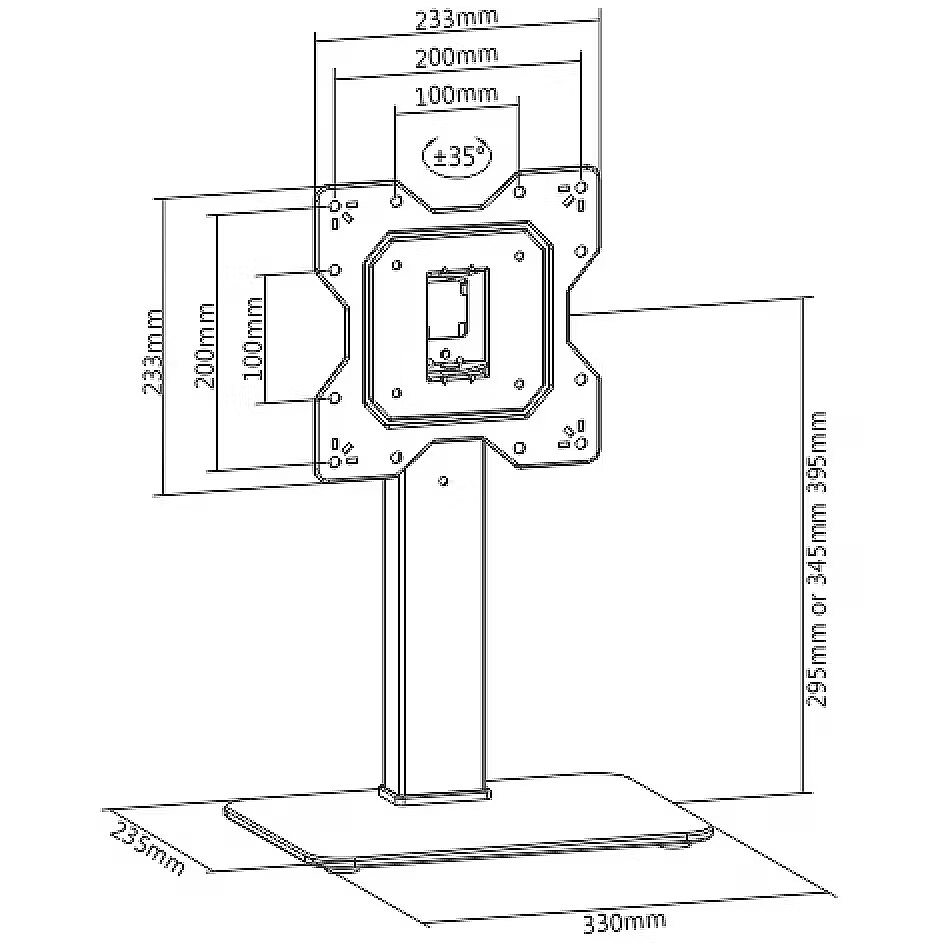 Description - Desk stand for LCD monitors from 23" to 43" and weighing up to 40 kg. Monitor rotation by +/- 35° for more viewing angles; adjustable height. VESA compatibility: 100x100, 100x200, 200x100, 200x200. Ergonomically position your monitor on your desk to increase workspace, reduce eye strain and improve posture. Solid construction made of powder-coated steel; elegant base made of high-gloss black tempered glass, adding a modern accent to your home or office (8 mm thick); integrated cable management. Stand dimensions: 330 x 235 x 510 mm; black.