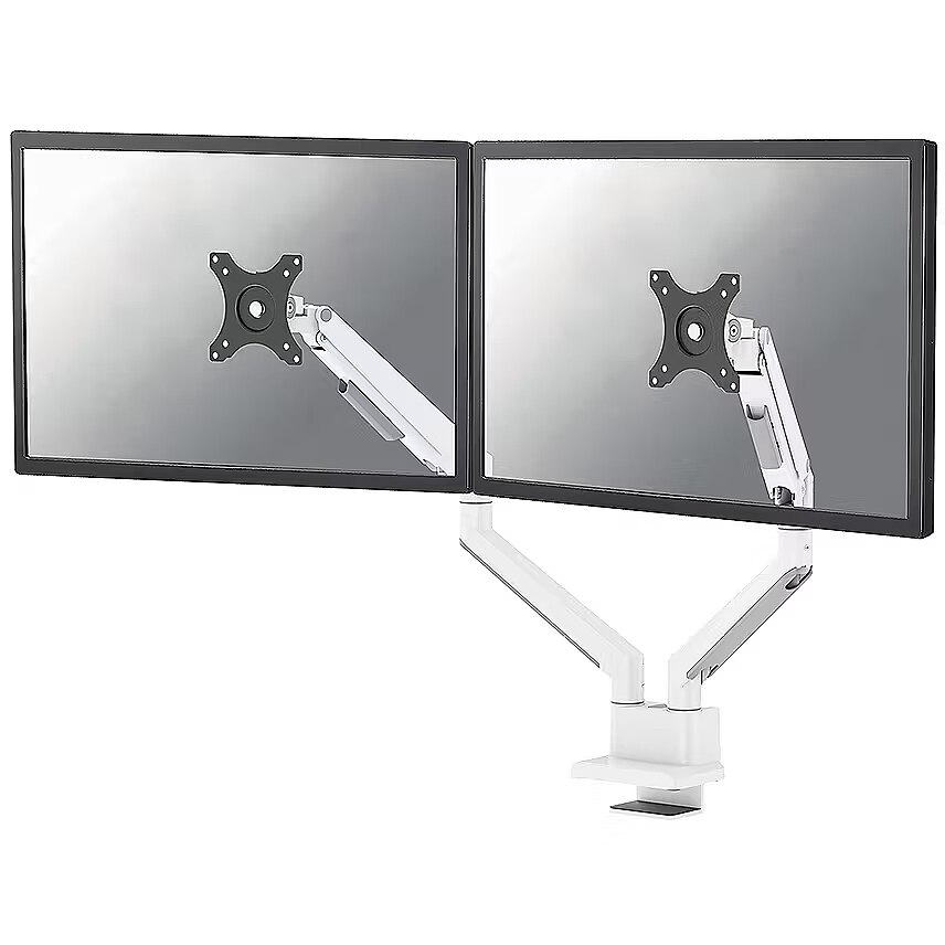 Short summary - Neomounts NEXT Slim DS70-250WH2 Dual monitor arm - 17-32" - 1-9 kg/screen (curved 8 kg/screen) - gas spring - 180°-stop - Topfix - Easy Install-model - 100% plastic-free packaging - white