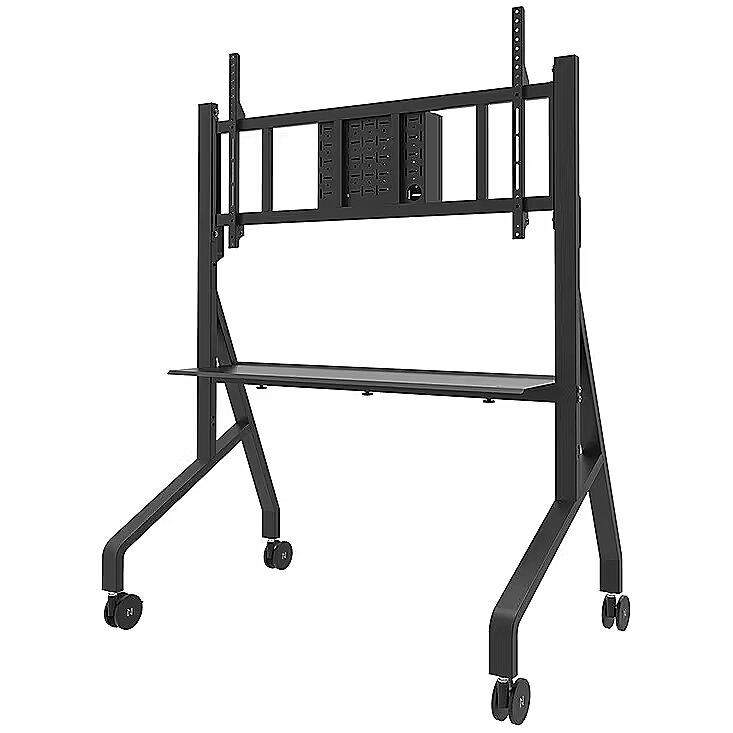 LongDesc - Meet the Neomounts FL50-575BL1 MOVE Go XL; the ultimate mobile solution for large screen displays up to 110" with a maximum weight capacity of 125 kg. This heavy-duty trolley is not just robust and reliable, but also quick and easy to assemble.Designed with a sturdy structure, the MOVE Go XL offers the perfect solution for large and ultra-wide 105" (touch) screens. The floor stand offers manual height adjustment in 2 preset positions, ranging from 129 to 139 cm, ensuring optimal viewing heights. For extra security, the screen can be fixed in place by locking the brackets using a padlock (not included). Additionally, a multimedia shelf (front and back mountable, max. 10 kg) and lockable, ventilated hardware compartment with cable opening are included and optional for installation. The MOVE Go XL is all about mobility. With its practical handles and four solid 100 mm double locking caster wheels, it moves effortlessly wherever you need it. Thanks to the large caster wheels, thresholds or carpets are no challenge for the FL50-575BL1. The low depth profile ensures easy doorway passage. Assembly is very easy, as the MOVE Go XL comes partially pre-assembled and includes a bolt box with a range of VESA fixings (ranging from 100x100 to 1100x600 mm). Thanks to the provided cardboard installation support, setup can be completed quickly by a single person in just minutes.Various accessories are available for the MOVE Go XL trolleys, such as a VESA 800 extension kit, a universal videobar kit and practical caster brake lock.