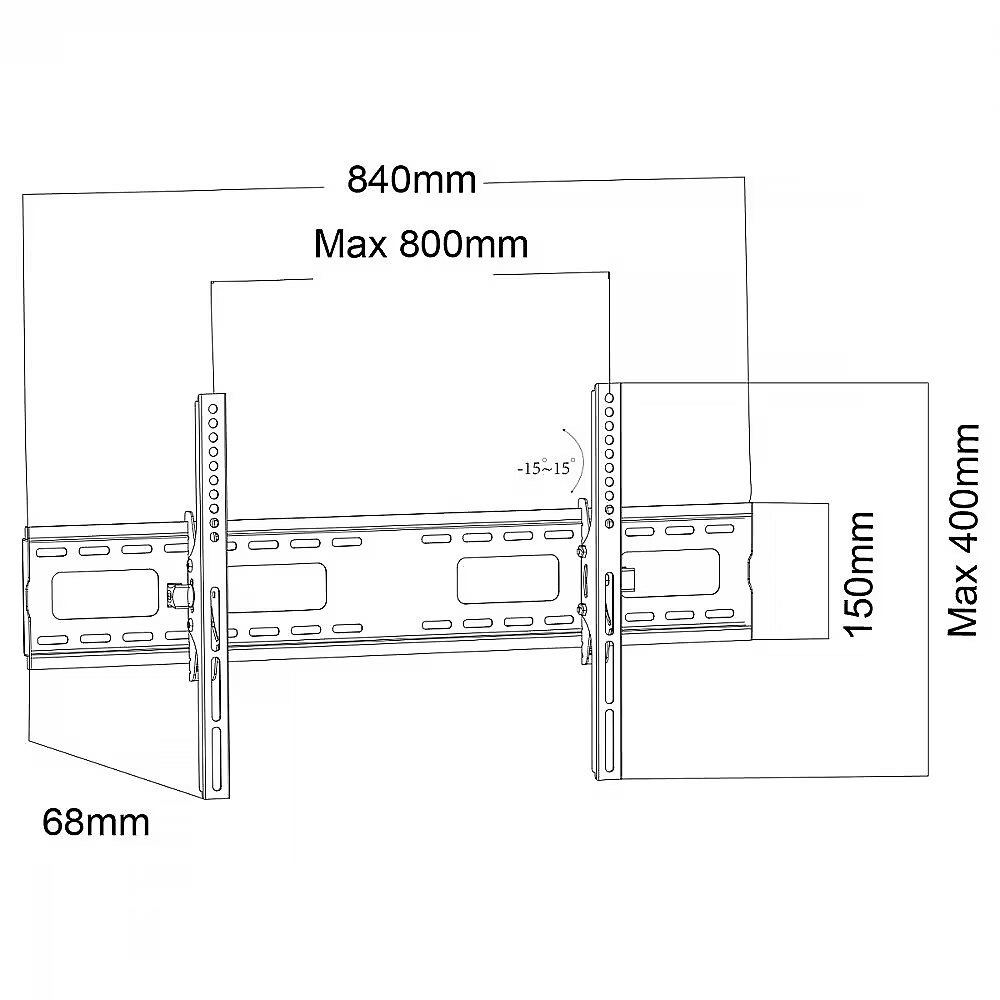 Other features - - Manufacturer: Maclean - Model: MC-422 - Maximum load: 120 kg - Minimum/Maximum horizontal spacing: 100/800 mm - Minimum/Maximum vertical spacing: 200/400 mm - Adjustable degree of tilt: +15°~-15° - Powder coating - Color: black - Distance from wall: 68 mm - Designed for 43" to 100" TVs (or larger if their weight does not exceed 120 kg and the VESA standard is compatible with the mount) - Comes with a set of mounting screws for the wall, as well as for screwing the TV and installation instructions - VESA: 100x200, 200x200, 200x300, 300x200, 200x400, 400x200, 300x300, 300x400, 400x300, 400x400, 600x300, 600x400, 800x400 mm