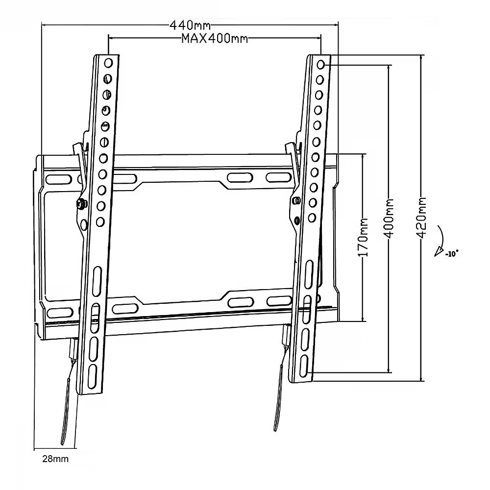 Other features - - Manufacturer: Maclean - Model: MC-412 - Maximum load: 45 kg - Minimum/Maximum horizontal spacing: 100/400 mm - Minimum/Maximum vertical spacing: 200/400 mm - Adjustable degree of tilt: +0°~-10° - Powder coating - Color: black - Distance from wall: 28 mm - Designed for 32" to 70" TVs (or larger if their weight does not exceed 45 kg and the VESA standard is compatible with the mount) - Comes with a set of mounting screws for the wall, as well as for screwing the TV and installation instructions - VESA: 100x200, 200x200, 200x300, 300x200, 200x400, 400x200, 300x300, 300x400, 400x300, 400x400 mm