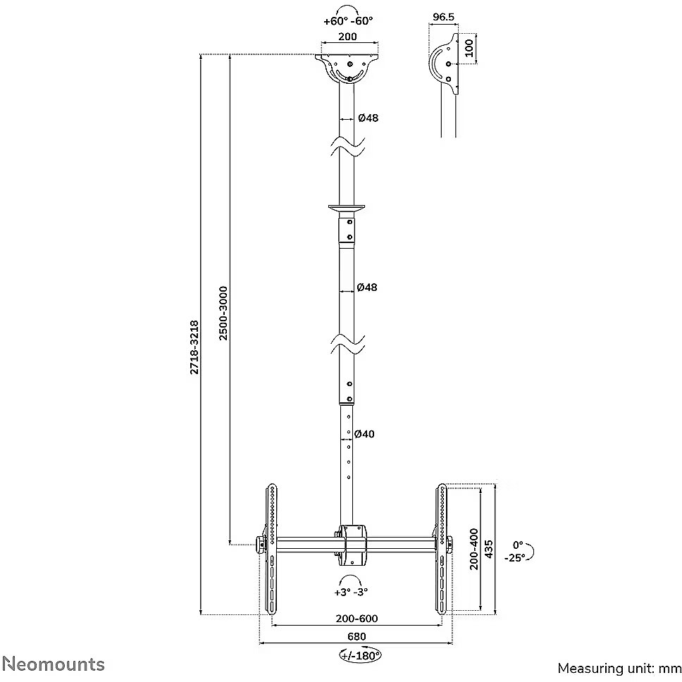 LongSummaryDescription - Neomounts CL35-440BL16XL Monitor/TV mount ceiling 37-70" - h 250-300 cm. Maximum weight capacity: 50 kg, Minimum screen size: 94 cm (37"), Maximum screen size: 177.8 cm (70"), Minimum VESA mount: 150 x 200 mm, Maximum VESA mount: 600 x 400 mm. Height adjustment range: 2500 - 3000 mm, Tilt angle range: -25 - 0°, Swivel angle range: -180 - 180°, Angle of rotation: 6°. Product colour: Black