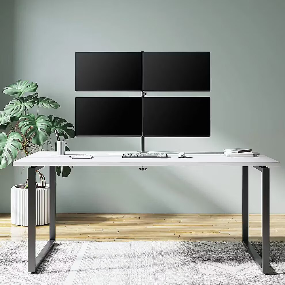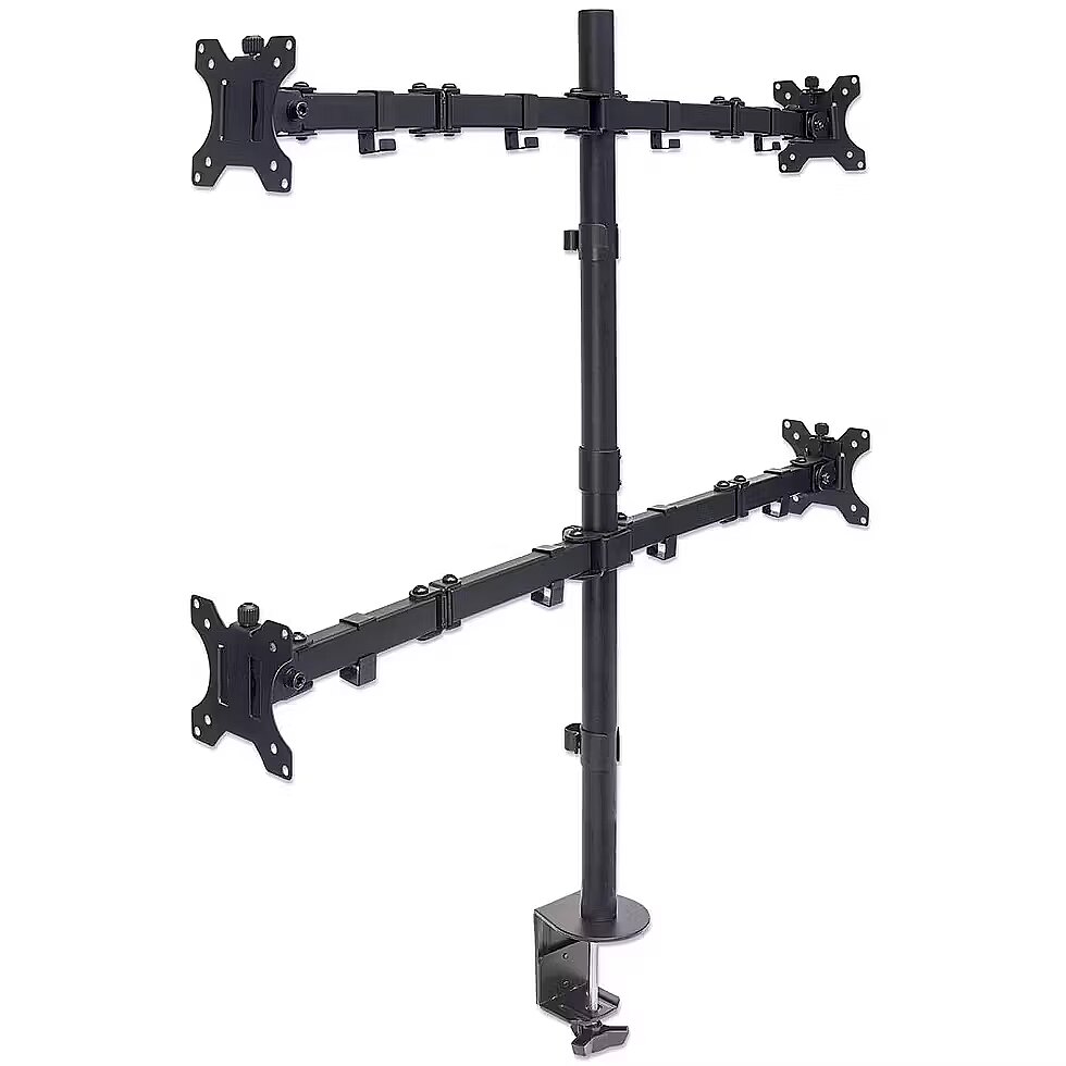 LongDesc - Manage the desktop. Maximize productivity._x000D_LCD-monitor installation above the desk helps maximize the effectiveness of a potential workspace. The Manhattan Universal Four Monitor Mount with Double-Link Swing Arms improves organization on the desktop, making it easier to get work done on the computer._x000D__x000D_Constructed from durable die-cast metal, this four monitor mount features a sturdy clamp that allows for quick, easy and secure mounting without the need to drill holes into desks or countertops. Its fully adjustable tilt, rotate, side-to-side, height and tension settings create the perfect position to comfortably increase productivity. Such adjustment capabilities can even help reduce eye fatigue or neck and back strain. In addition, the mount pole offers easy monitor rotation to allow others to view presentations and multimedia productions from almost any direction.
