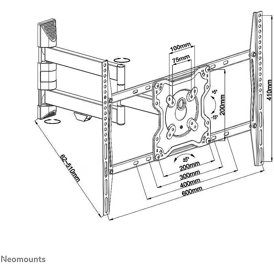 LongSummaryDescription - Neomounts FPMA-W460BLACK TV mount wall 42-70" - full motion. Maximum weight capacity: 40 kg, Minimum screen size: 106.7 cm (42"), Maximum screen size: 177.8 cm (70"), Minimum VESA mount: 75 x 75 mm, Maximum VESA mount: 600 x 400 mm. Tilt angle range: 0 - 20°, Swivel angle range: 0 - 180°, Angle of rotation: 10°, Distance to the wall (min): 6 cm, Distance to the wall (max): 51 cm. Product colour: Black
