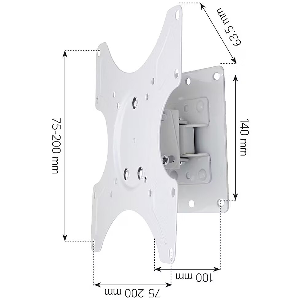 LongDesc - - Universal bracket for fixing a LED / LCD or a monitor on the wall; easy and quick to install, it is ideal for home, office and commercial applications.Features- Bracket suitable for LCD LED 19-37";- Supports VESA 75x75, 100x100, 200x100, 200x200 mm;- Maximum weight supported: 25 kg;- Arm 1 joint.Specifications- Tilt from 0 to -12°;- Horizontal direction: 30°;- Minimum distance from the wall: 63.5 mm;- Dimensions: 100 x 140 mm wall plate; 0.8kg;- White color.The package includes- Wall support for LCD LED;- Mounting accessories (screws, plugs ...) and installation instructions.