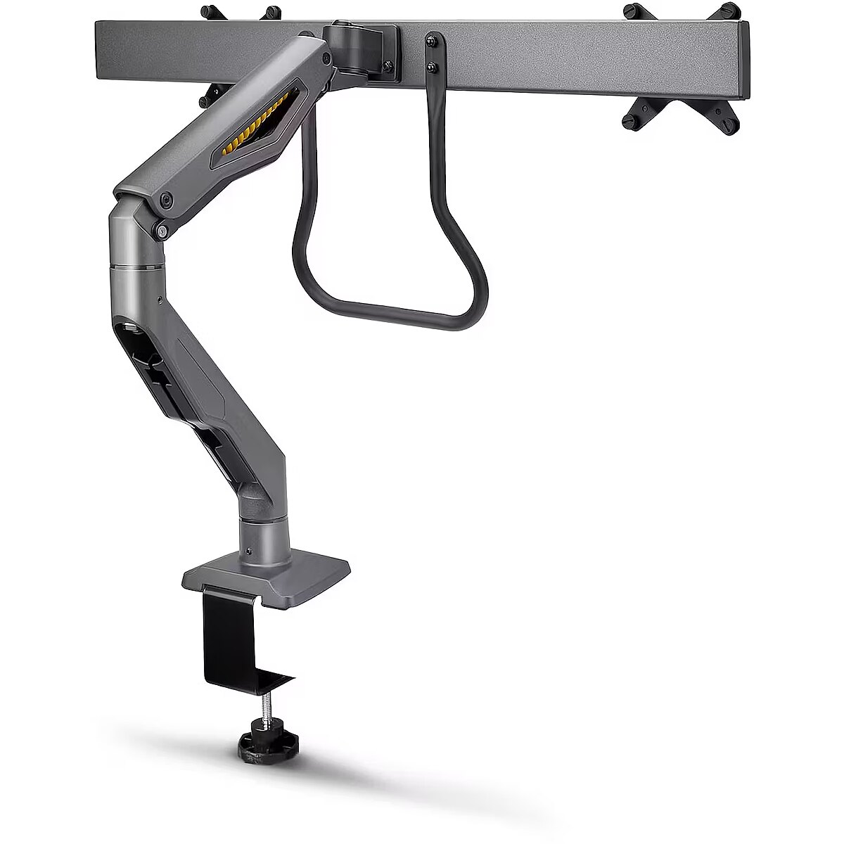 LongDesc - Dual monitor desk mount with support for up to 27" monitors with height adjustable spring armThis crossbar monitor desk mount is designed to support up to two 27-inch displays, creating an ergonomic multi-monitor setup that provides an extensive viewing area for productivity. The built-in handle enables moving all monitors simultaneously, while the spring-assisted arm enables multiple adjustments to suit different ergonomic needs.Height Adjustment with One Smooth MotionThe mechanical spring arm enables toolless height adjustment of up to 12.9in (32.7cm) with effortless one-touch motion. The maximum arm extension is 22.6in (57.4cm) and a total weigh capacity of 33lb (15kg).Visual ExperienceThis monitor mount is ideal for bezel-less or slim bezel displays, creating a more extensive and seamless viewing experience that enhances multitasking and productivity. The VESA mounts can slide along the crossbar, allowing for further adjustments.Range of MotionThe monitors' VESA mounts enable support +/-15° swivel, +65/-15° tilt, and 360° screen rotation for portrait/landscape orientation.Cable ManagementTo maintain an organized workspace, the arms feature a cable management channel along the underside to keep cables out of sight, reducing clutter and contributing to a tidy setup.The StarTech.com Advantage