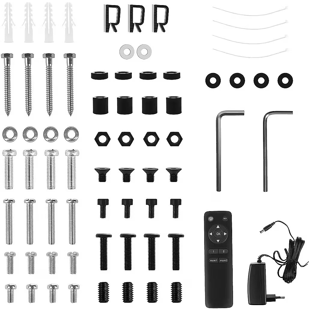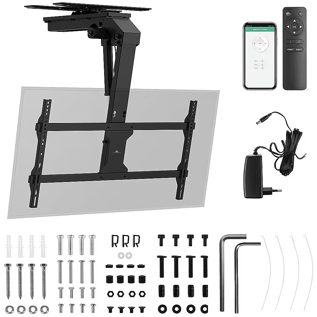 Accessories included - Maclean MC-109 T electric TV mount Set of mounting screws for ceiling and for screwing the TV Mounting accessories Installation instructions Manufacturer's packaging