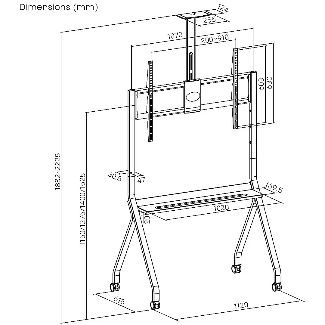 Other features - Model: MC-114 B Color: black Material: powder coated steel, plastic Designed for TVs with diagonal: from 55 to 100" VESA standard: 200x200, 300x200, 400x200, 300x300, 400x300, 600x200, 400x400, 600x300, 600x400, 800x400, 600x600, 800x600, 900x600 mm Dimensions: 1120 x 711 x 2220 mm Maximum bracket load: 120 kg Maximum shelf load: 10 kg Maximum load of camera shelf: 5 kg Ability to hang the TV at 4 heights: 1150 / 1275 / 1400 / 1525 mm