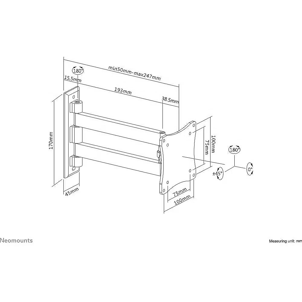 Neomounts' tilt (90°) and swivel (180°) technology allows you to change the viewing angle of the mount to fully utilize the capabilities of your flat screen. The mount's depth can be easily adjusted from 5 to 25 centimeters.