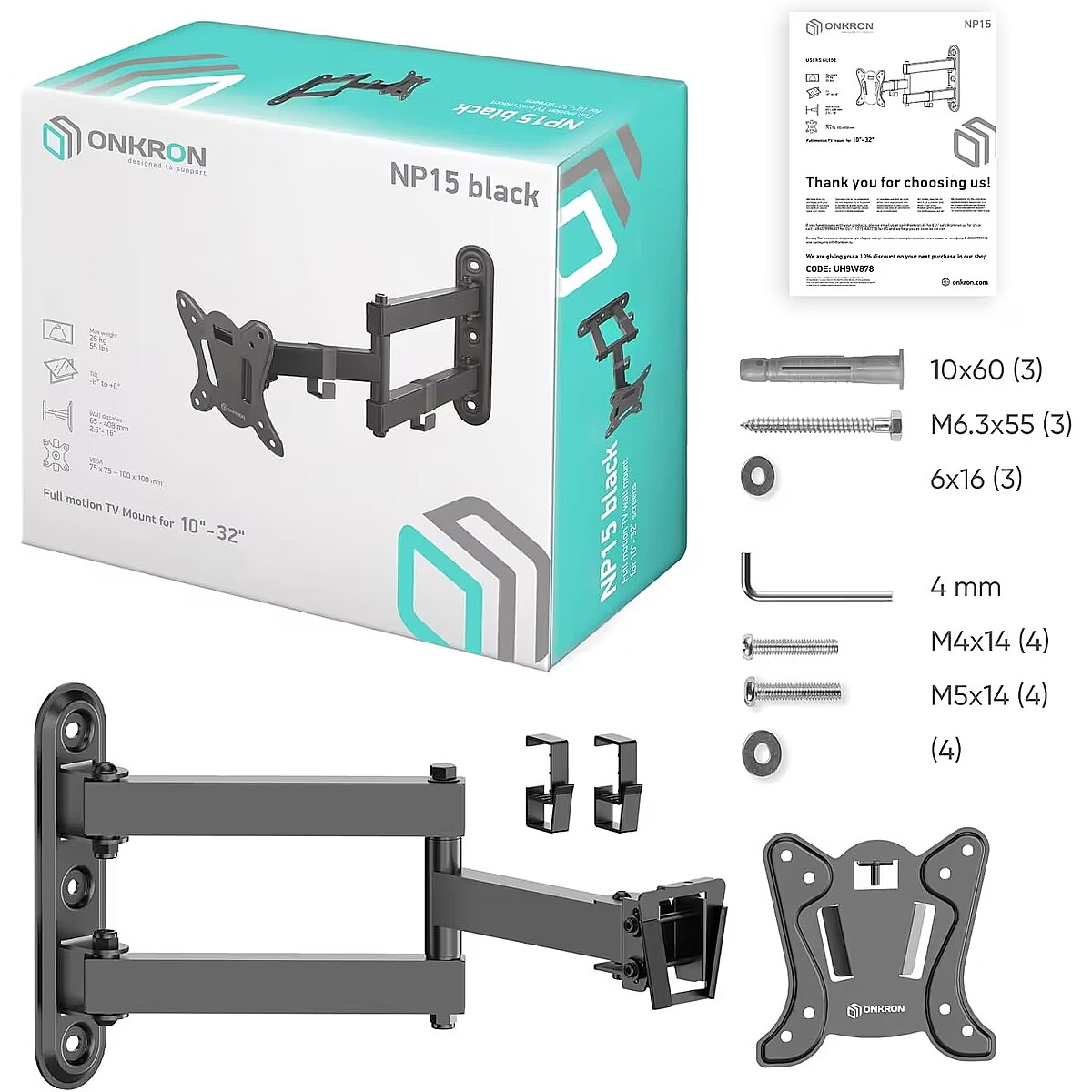 Description - ONKRON Tilting and swiveling Wall Mount for 10"- 32" screen, max 25 kg, VESA up to 100x100