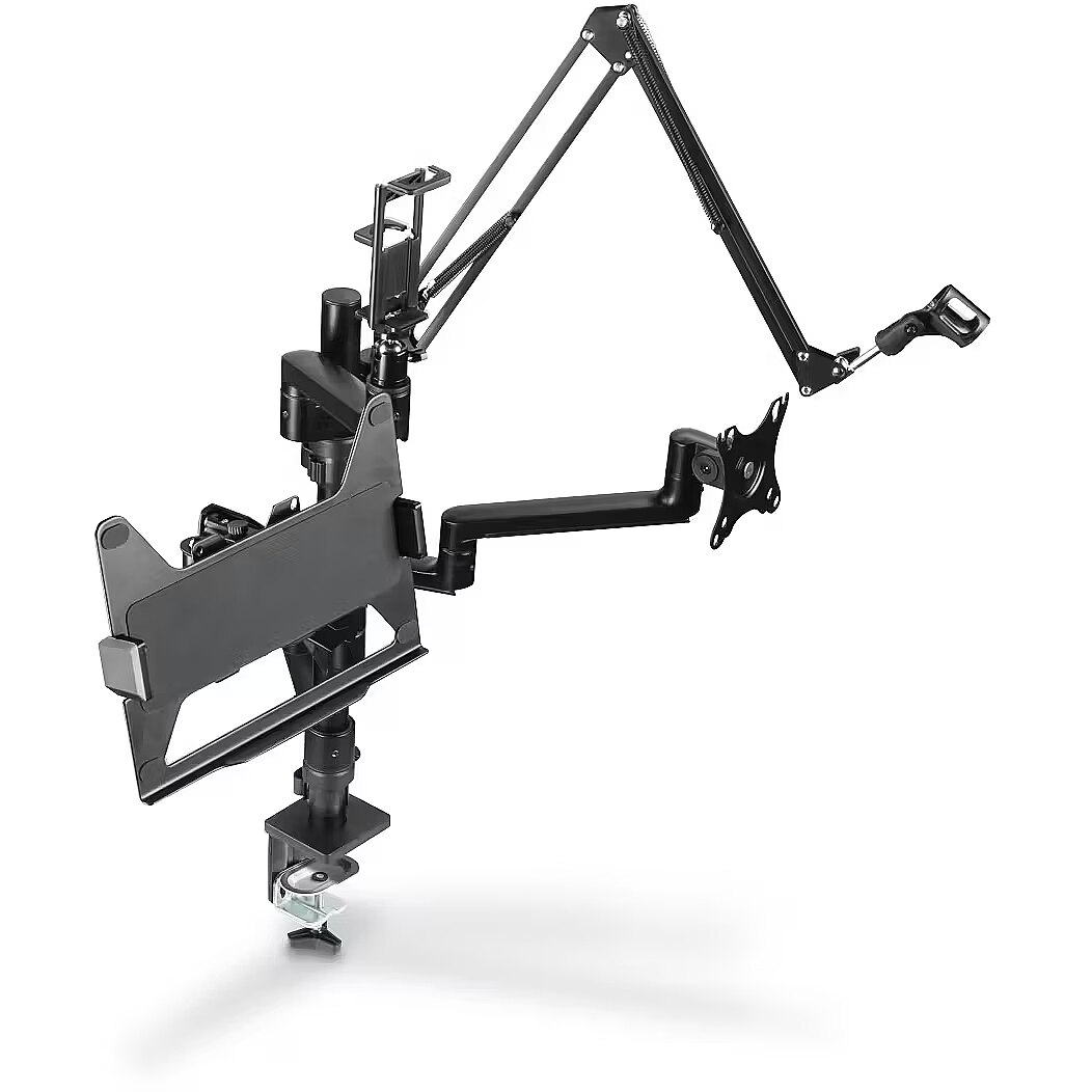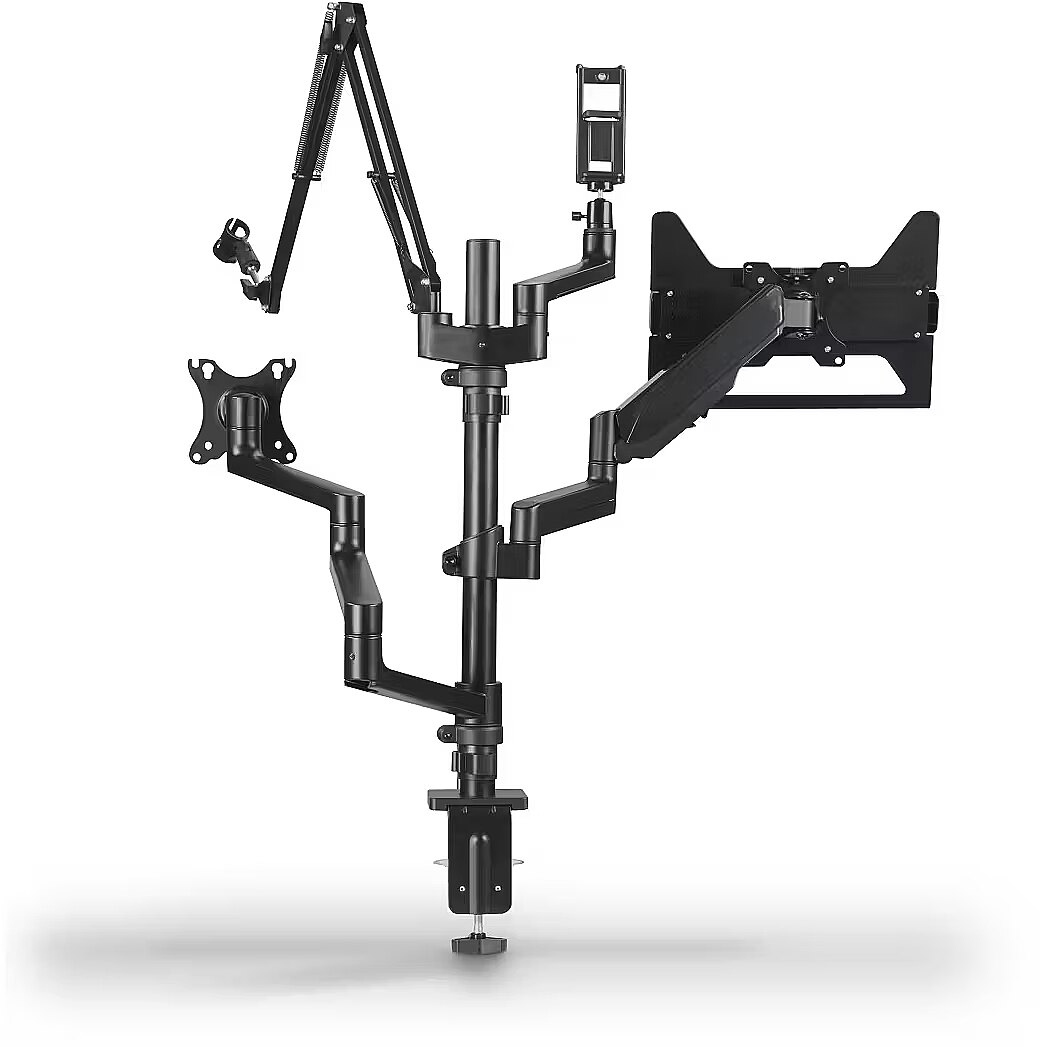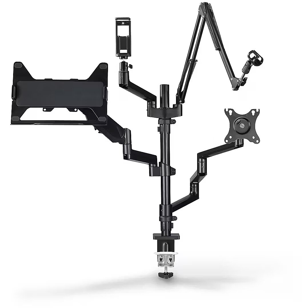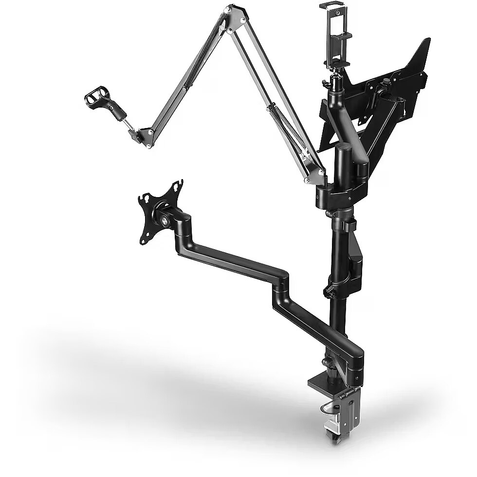 LongDesc - The demands of streaming, gaming and everyday office life combined in just one monitor mount. Ergonomic, functional and tidy - this is how desk work is done today!Better ergonomics at your workstation and while streamingAfter the last streaming session or the hour-long call you just finished, does your head hurt, your neck feel stiff and your back also ache? Then it's high time for an ergonomic workstation. And while most people think of a suitable office or gaming chair, they quickly forget that the correct positioning of equipment such as monitor, laptop, streaming light and camera also ensures a sitting posture that is easy on the neck and back. It's a good thing that the monitor holder for your streaming setup adapts to your individual needs with no fewer than four height-adjustable arms . So you can quickly and easily retrofit your desk ergonomically and are perfectly equipped for more hours at the PC or laptop.Monitor holder for streaming setup and officeDo you want to interact with your followers in the livestream studio or record the latest episode of your own podcast? Or are you more into Twitch and want to live stream the latest gaming session? Are you a vlogger and need a new reel or even a longer video for YouTube or Instagram? Or do you work in a classic office or home office and simply want to ensure better ergonomics at your computer workstation? With this universal mount, no wishes remain unfulfilled, thanks also to the included accessories.Microphone arm, monitor arm, tablet holder and moreOne or two monitors, tablet or micro, light or camera - the requirements for your workstation can change at any time. So simply rebuild the streaming arm as you need it!One for allPerfect for the next streaming or gaming session: whether webcam, microphone, smartphone or tablet, ring light or camera, monitor or laptop, there is room for a lot of streaming equipment on the four arms, making it ideal for bloggers, streamers, gamers and so onFully mobile monitor holderFor an ergonomic workstation: the streaming arm adapts to your personal requirements and posture. Whether you need stepless height adjustability, swivel and tilt functions, pull-out capability or portrait or landscape formats, this is how ergonomics works in the office and home office while gaming2 monitors up to 32 inches and 8 kilogramsSpace for two monitors: the monitor arms be used for all common screen sizes with a diagonal of 33 - 81 cm (13 - 32") and up to a weight of 8 kg per armTripod ball headUnusual recording angle: Streaming light or camera can be rotated and tilted thanks to tripod ball head - for the perfect streaming setupPortrait and landscape formatAlways the perfect recording position: Portrait and landscape format thanks to swivelling smartphone and tablet holderIntegrated cable managementFor tidy workstations: Cable management guides the monitor cable tidily behind the screen, avoiding cable spaghetti and saving space. The cable guide also protects the cable against breakage thanks to strain reliefSimple assemblyFast and straightforward desktop installation: The monitor holder is attached to the desk in an instant with the clamping screw. VESA makes installing the screen easier - first put the VESA plate on the monitor, then hook it in the screen holder, and you're done