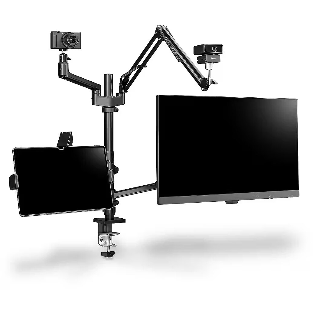 LongDescription EN - Ergonomics for long work and streaming sessionsThe Hama monitor holder is designed to improve posture and reduce strain on the neck and back. Proper positioning of monitors, cameras and accessories helps maintain comfort during long working hours or extended streaming sessions. A versatile solution for streaming and office useThe four-arm design allows flexible combinations of equipment, including one or two monitors, a laptop, tablet, microphone, camera or light. The setup can be easily reconfigured as your needs change. Supports two monitors up to 32 inchesThe monitor arms support screens from 13 to 32 inches with a maximum weight of 8 kg per arm. Compatibility with VESA 75 x 75 and 100 x 100 standards ensures broad device support. Fully adjustable and flexible movementEach arm offers stepless height adjustment, swivel, tilt and extension. Tablet and smartphone holders support both portrait and landscape orientation, while the camera arm with tripod ball head enables precise angle adjustment. A tidy workspace with cable managementIntegrated cable management keeps cables neatly routed behind the screens, improving desk organisation and protecting cables from wear. Unused arms can be removed to maintain a clean, uncluttered look. Quick and easy installationThe holder mounts securely to the desk using a clamp system. VESA plates make monitor installation fast and straightforward, allowing you to set up your workstation in minutes.