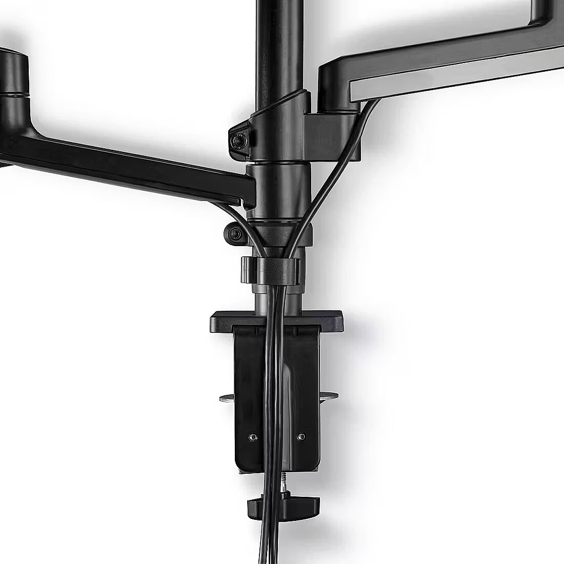 Integreeritud kaablite haldus juhib juhtmed korrektselt ekraanide taha, parandades töökoha korrastatust ja vähendades kaablite kulumist. Kasutamata õlad saab eemaldada, et hoida lahendus puhas ja minimalistlik.
