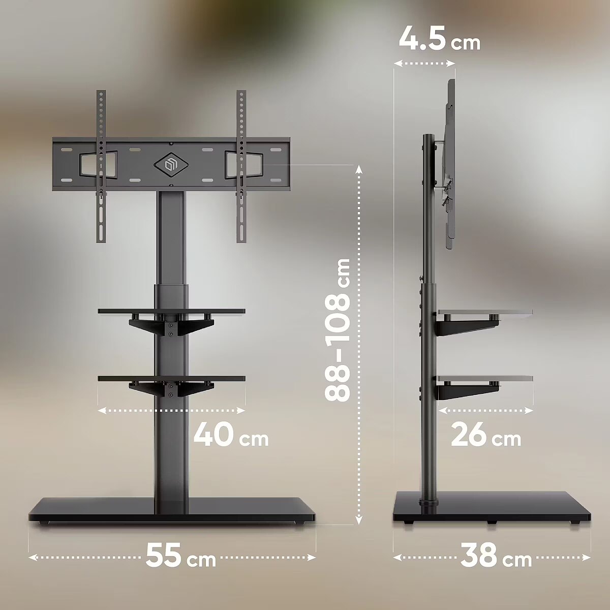 Description - For TVs 32"–65"Max TV weight: 30 kgMax shelf load: 5 kg (x2)VESA: 100x100, 100x200, 200x100, 200x200, 200x300, 200x400, 300x100, 300x200, 300x300, 300x400, 400x200, 400x300, 400x400, 500x200, 500x400, 600x200, 600x300, 600x400 mmVESA center height adjustment: 880–1080 mmOverall height: 1095–1295 mmHeight adjustment in 50 mm stepsDistance from column to wall: 39 mm3 vertical VESA panel mounting positionsSwivel angle: -25° ~ +25°Clips included for cable management behind columnTwo AV shelves 400x260x5 mm eachBase dimensions: 550x380x8 mmMaterials: cold-rolled steel, tempered glass