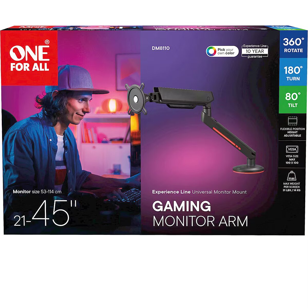 Name - ONE FOR ALL Universal Gaming Single Monitor Arm (DM8110), Monitor Mount Grey, RGB