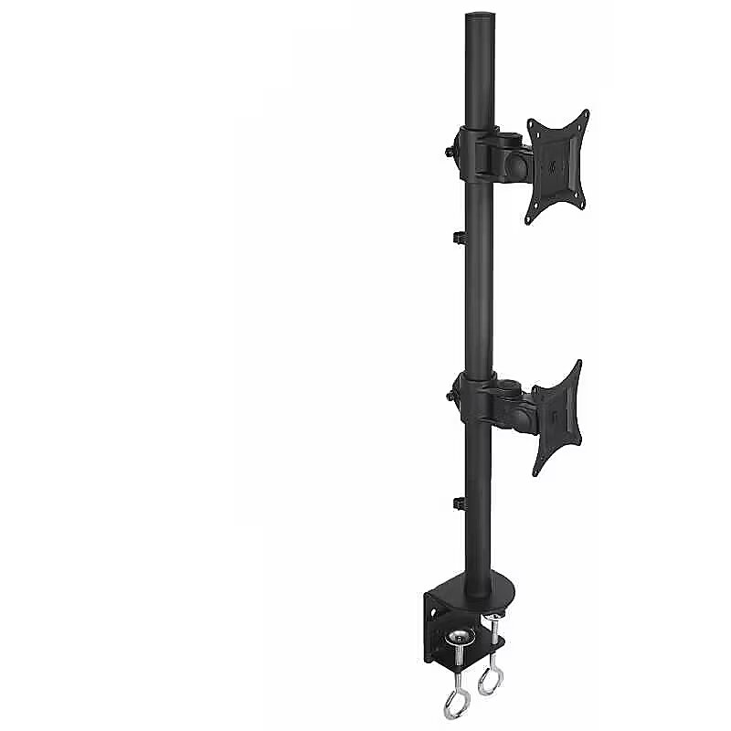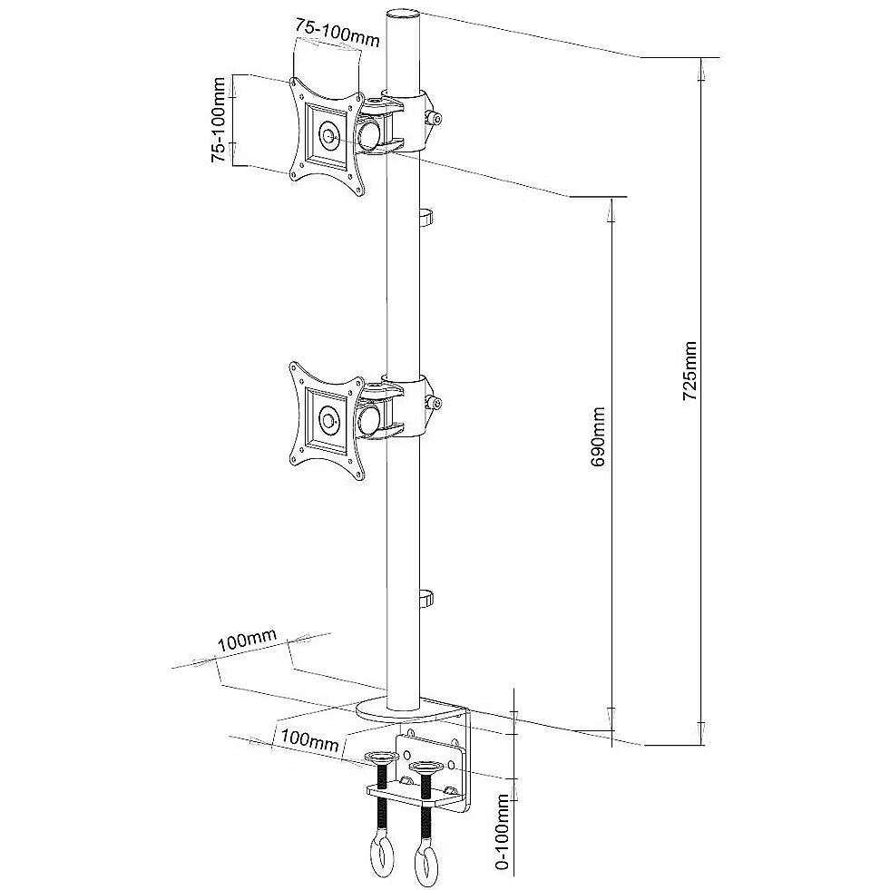 LongDesc - - Double desktop stand, ideal to support two monitors, increasing the working space and reducing clutter; optimizes ergonomics allowing you to adjust the angle, height, rotation to locate the best viewing position of the screens- Easy to install, it is ideal for home, office and for other special applicationsFeatures- Bracket desk for 2 monitors 13-27 "- Supports VESA 75x75 and 100x100 mm- Maximum weight supported: 20 kg (10 kg for each VESA)- Stand pipe 35mm- Height adjustable and durable clamp to secure the stand to the desk steadily- Integrated cable management- Fully adjustable, the monitor can be tilted, rotated, turned for maximum viewing flexibility- Color: Black