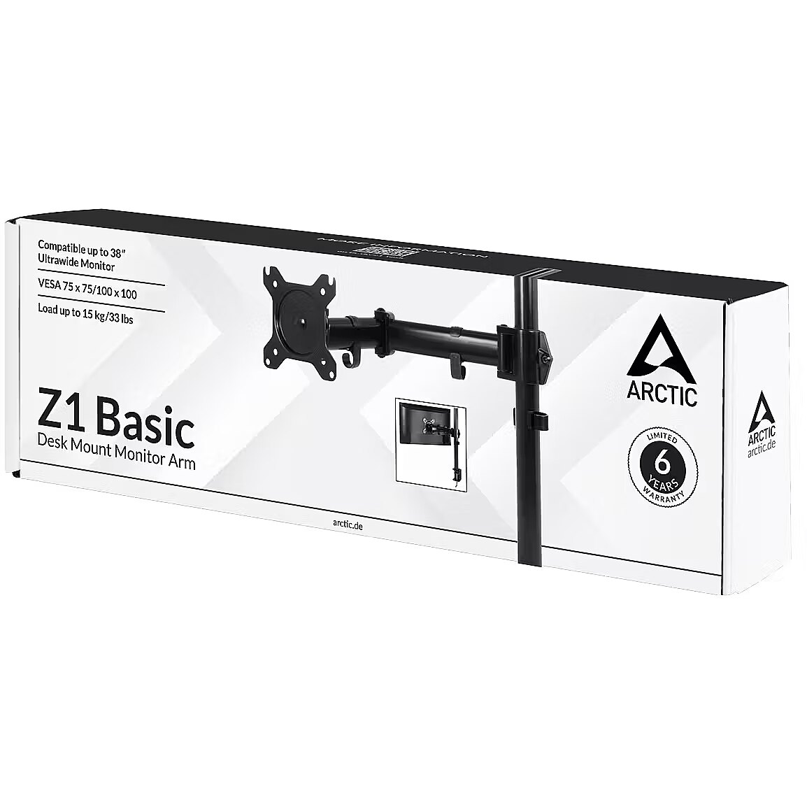 LongSummaryDescription - ARCTIC Z1 Basic - Desk Mount Monitor Arm. Mounting: Clamp, Maximum weight capacity: 8 kg, Minimum screen size: 33 cm (13"), Maximum screen size: 81.3 cm (32"), Minimum VESA mount: 75 x 75 mm, Maximum VESA mount: 100 x 100 mm. Tilt angle range: -15 - 15°. Product colour: Black