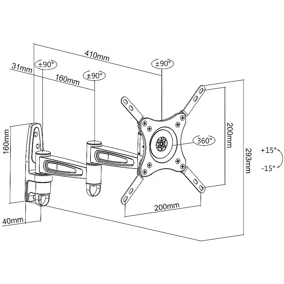 LongSummaryDescription - Multibrackets M VESA Flexarm 360 III Black 75 100 200. Maximum weight capacity: 15 kg, Minimum screen size: 38.1 cm (15"), Maximum screen size: 81.3 cm (32"), Minimum VESA mount: 75 x 75 mm, Maximum VESA mount: 200 x 200 mm. Tilt angle range: -15 - 15°, Angle of rotation: 360°, Distance to the wall (min): 8 cm, Distance to the wall (max): 41.8 cm. Product colour: Black