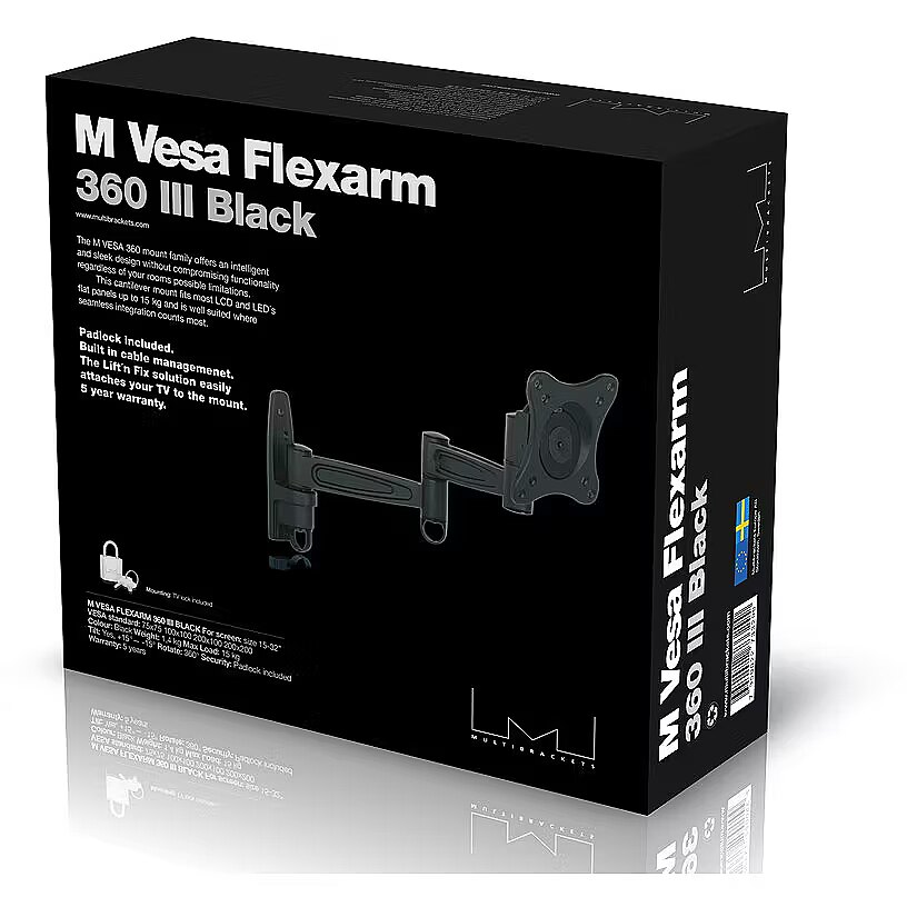 LongDesc - M VESA Flexarm 360 I, M VESA Flexarm 360 II, M VESA Flexarm 360 III. Looking for the ultimate VESA based wall mount? We think you found it.The M VESA Flexarm 360 offers a flexible alternative to rigid wall mounts for displays weighing up to 15kgs. Multibrackets VESA Flexarm 360 can both tilt and rotate. Still it is safely secured with the included padlock.Perfect for public environments where flexible installations and security is of essence. Of course even better for home installation with its quick and easy installation combined with the useful tilt and rotation function.The new flexible, and safe solution to mount your LCD TV.