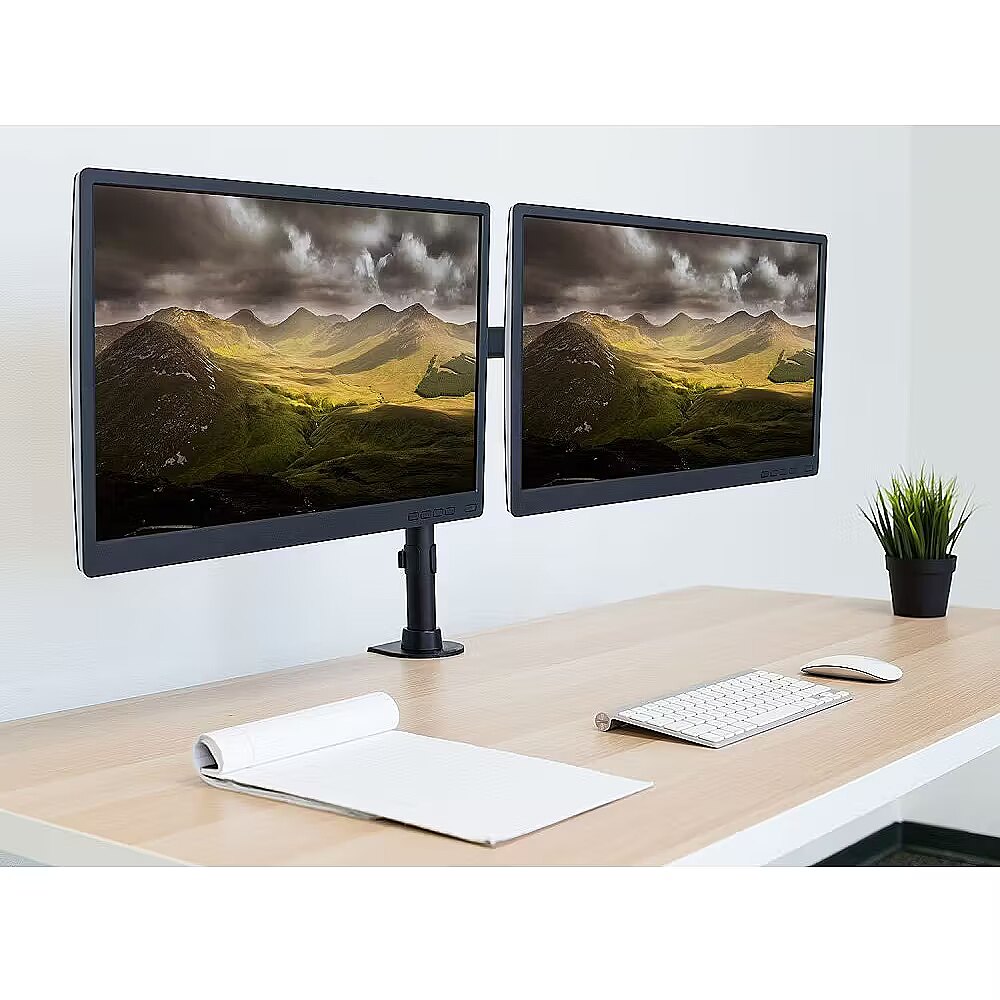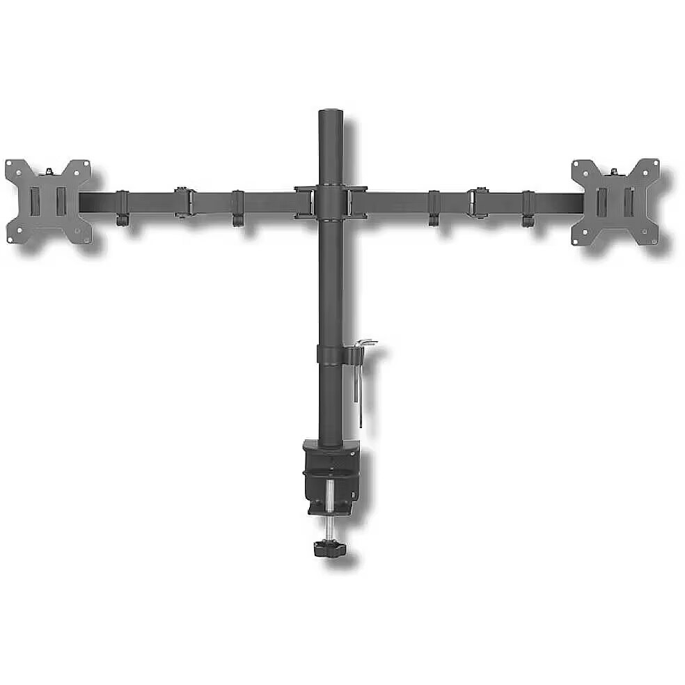 LongDesc - - Desk double stand ideal for support of two monitors, to increase work space and reducing clutter; optimizes ergonomics allowing you to adjust the angle, height, rotation to locate the best position of visibility of the screens- Easy to install, it is ideal for home, office and other special applications- Installation via terminal "C" or by passing screwFeatures- Desk Bracket for 2 monitors 13-27" side by side- Supports VESA 75x75 and 100x100 mm- With quick release system plaque VESA- Maximum weight supported: 20 kg (10 kg for each VESA)- High support hose 450 mm- Clamp height adjustable and durable to secure the stand to desk in a stable way- Integrated cable management- Fully adjustable, the monitor can be tilted, rotated, shot for maximum viewing flexibility- Black ColourSize- Base width: 93 mm- Base depth: 93 mm- Max adjustable height of the tube: 450 mmPackage contents- Desktop dual monitor support- Fixture- Installation Instructions