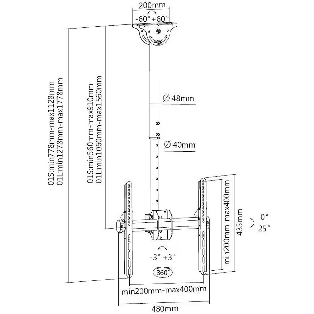 LongSummaryDescription - Techly 32-55 Telescopic Ceiling Universal LED TV LCD Support" ICA-CPLB 944S. Maximum weight capacity: 50 kg, Minimum screen size: 81.3 cm (32"), Maximum screen size: 139.7 cm (55"), Minimum VESA mount: 200 x 200 mm, Maximum VESA mount: 400 x 400 mm. Height adjustment range: 560 - 910 mm, Tilt angle range: -25 - 0°, Swivel angle: 360°. Product colour: Black