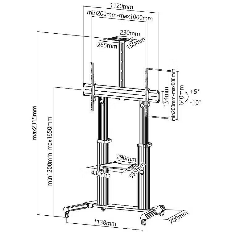 LongDesc - Floor stand for large TV: supports 60-100 "LCD LED TV- Supports VESA: 1000x600 max- Maximum TV weight supported: 100 kg- Tilt: + 5°/ -10°- TV height adjustable from 1200 to 1650 mm- Provided with shelf for audio-video equipment and additional camera shelf- Total height: 2315 mm- Color: silverSpecifications - Supports VESA 200x200, 400x200, 300x300, 400x400, 600x400, 800x400, 800x600, 1000x600- TV stand adjustable in height (1200-1650 mm) and tiltable from + 5° to -10°- Shelf for AV components; dimensions: 290-430 (L) x 335 (D) mm; maximum weight supported 5 kg- Additional upper shelf for a video camera; dimensions: 230-285 (L) x 100 (D) mm- Additional safety provided by the solid base with solid wheels- Base dimensions: 1138 (L) x 700 (D) mm- Total height: 2315 mmPackage Contents - Telescopic Height Adjustable Ultra-large Display TV Cart with wheels, shelf and upper camera bracket- Installation material and instruction manual