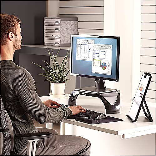 LongDesc - A few easy adjustments to your workstation can make a huge difference to your daily routine. Moving your head to view your screen or to read documents requires you to tilt and turn your neck and upper back. Positioning your screen incorrectly can put serious strain on your eyes, neck and shoulders which is why the Smart Suites computer stand is a necessity for your workspace as it allows you to place your monitor at a more ergonomically-correct viewing position to suit you. This adjustable monitor stand can support up to a 21-Inch flat panel monitor or a maximum weight of 10 kg. accommodate the ideal viewing angle that ideal suits your needs, the Smart Suites computer stand features three height adjustable settings (100 mm, 115 mm and 130 mm) allowing you to find a comfortable screen position accustomed to you. This monitor riser is accredited by FIRA International, an independent Ergonomic Accreditor.