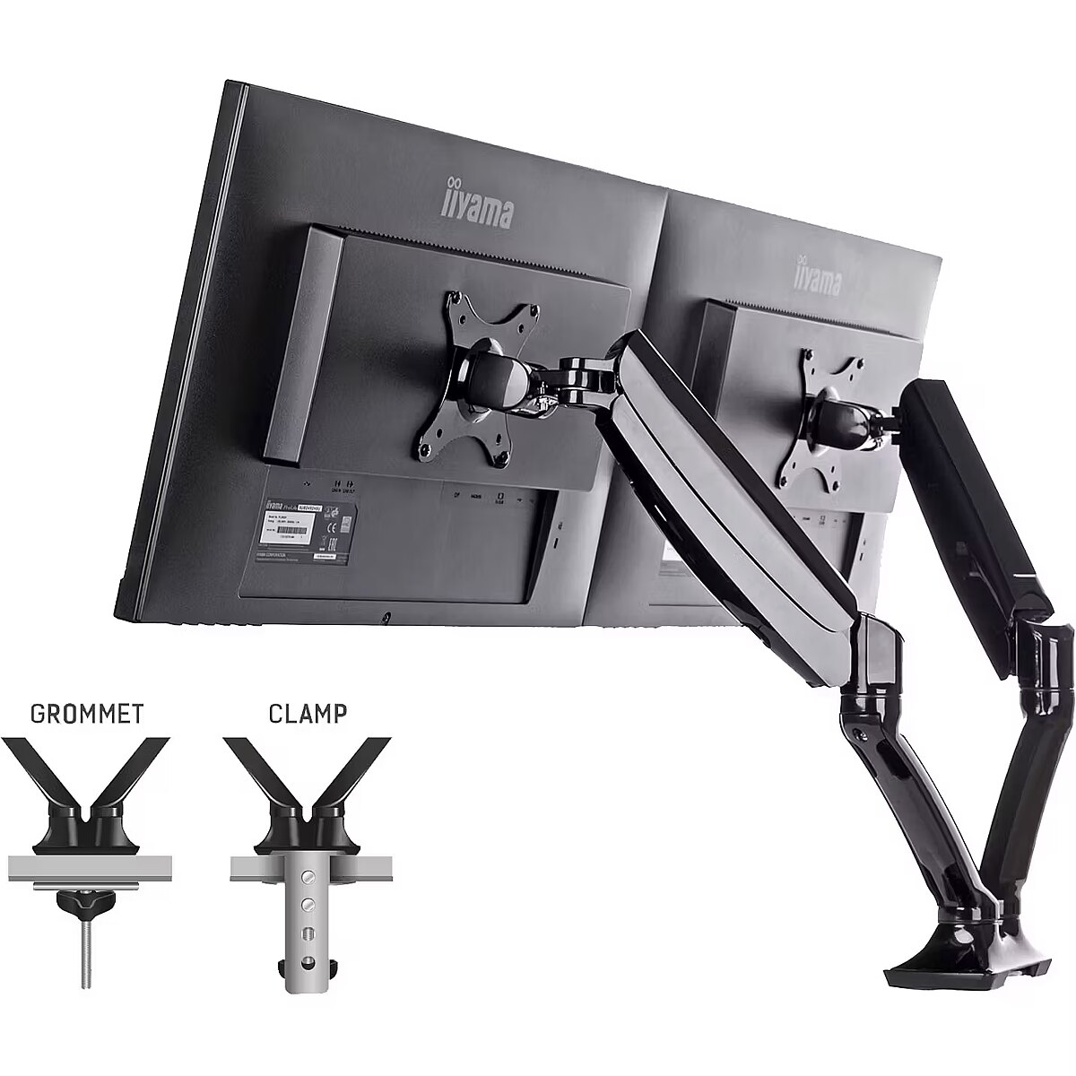 LongDesc - The iiyama DS3002C-B1 is a desk mount (grommet or clamp) for two flat screens up to 27”. Using the arm you save space on your desk and thanks to the cable management system it is easier to keep your workplace tidy. But what is more important, offering broad adjustment capabilities including tilt, swivel, height and rotation, the dual gas spring arm makes sure you can easily adjust the position of the screens to your preferences assuring ergonomic body posture.