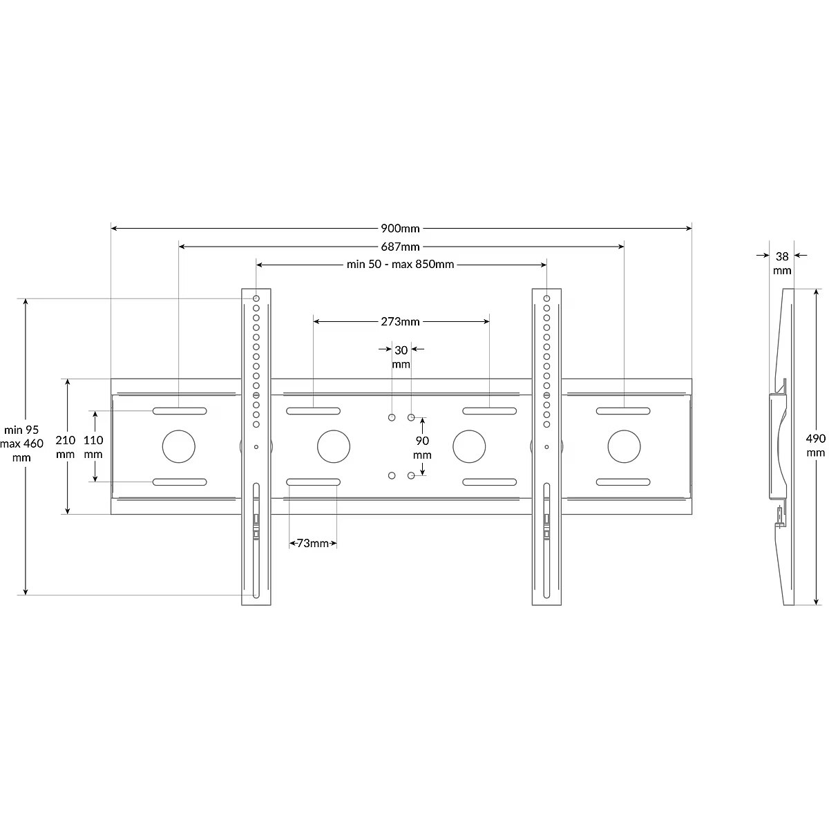 Technical details > Other features - Wide range of VESA mounting holes. 3 mm heavy duty steel. Lateral adjustment of the screen once mounted on the wall plate. Suitable for installation on brick, concrete, plaster and wooden walls