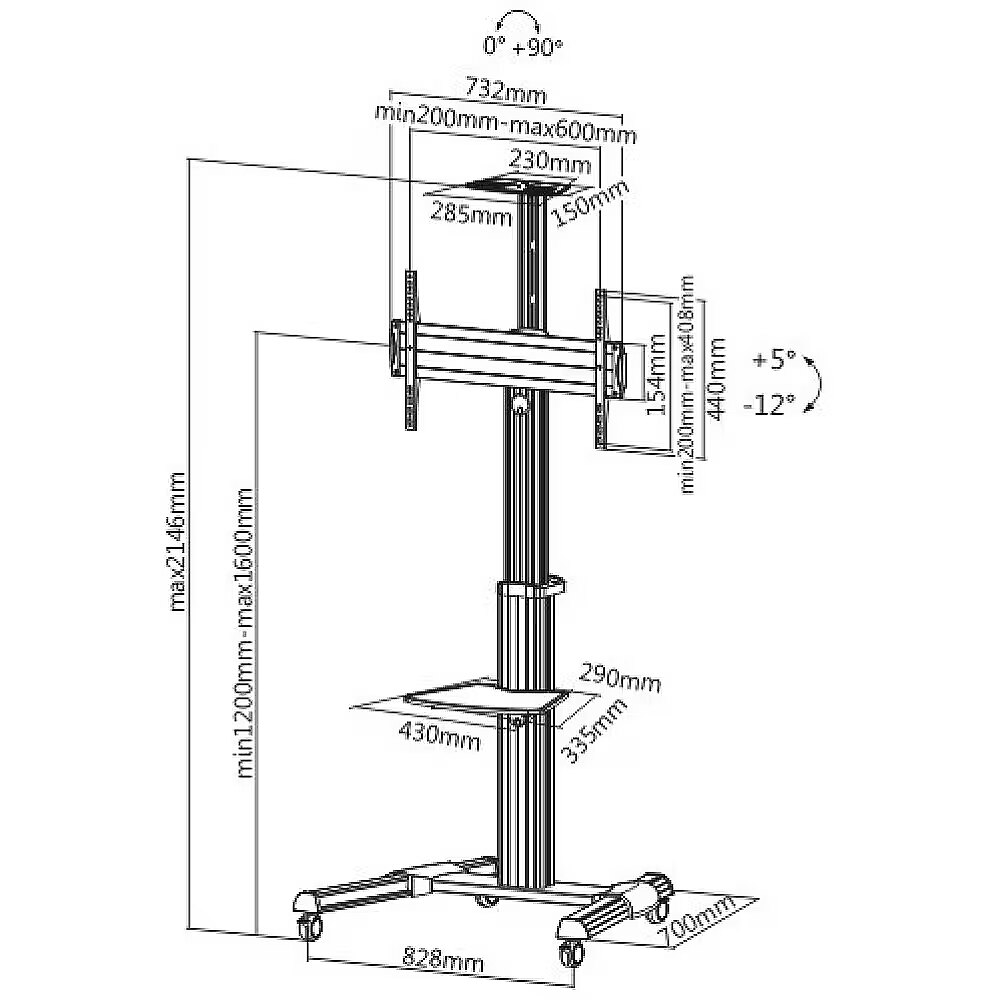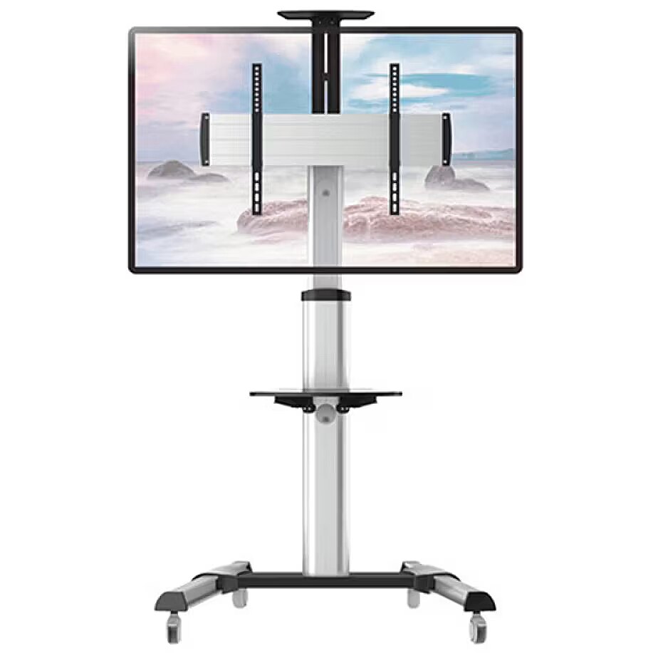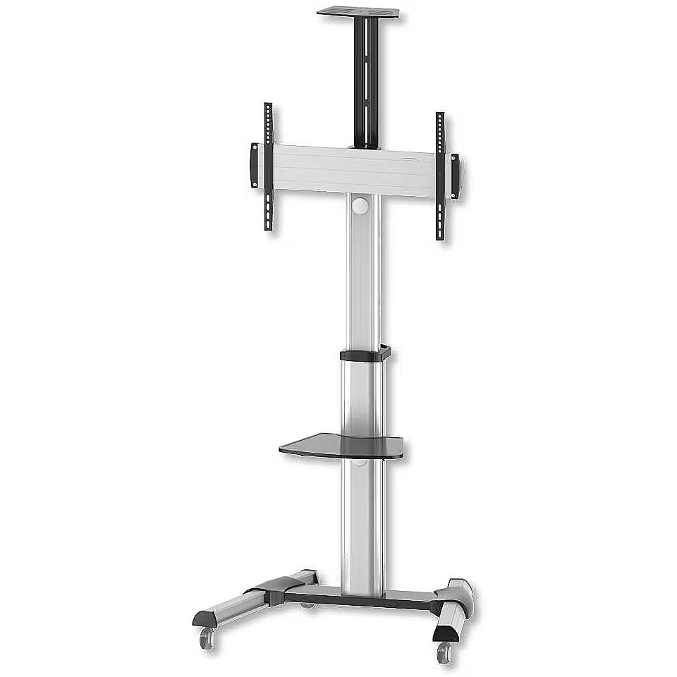 LongDesc - - Support for LED / LCD 37"-70" (VESA maximum supported: 600x400);- Maximum load capacity: 50kg TV; DVD 5kg; camera 5kg;- Equipped with 6mm tempered glass shelf components for AV adjustable height;- Additional upper shelf for supporting a camera;- Bracket for TV adjustable height and tilt of +/- 15°;- Rotation TV bracket of 90°;- Sturdy base with wheels with brake for maximum stability;- Color silver.Dimensions- Total height column: 1900 mm;- Base dimensions: 750 (L) x 700 (D) mm;- glass shelf Dimensions: 540 (L) x 350 (D) mm;- Dimensions top shelf: 300 (L) x 230 (D) mm.Package Contents- Trolley for TV with 4 wheels;- Glass shelf for AV equipment;- Upper bracket for camera;- Installation accessories;- Instruction manual.