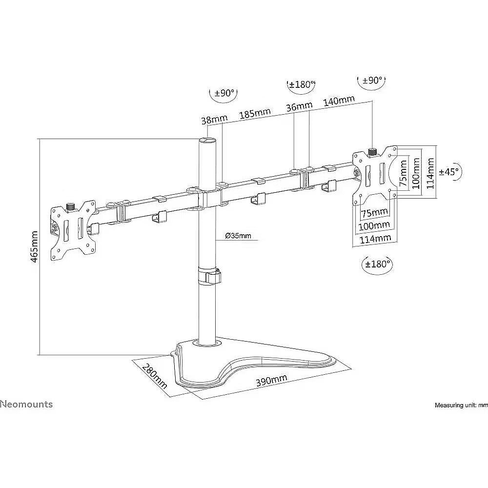 Description - The Neomounts by Newstar desk mount, model FPMA-D550DDBLACK is a tilt-, swivel and rotatable desk mount for 2 flat screens up to 32?. This mount is a great choice for space saving placement on desks using a desk stand. Neomounts by Newstar's versatile tilt (90°), rotate (360°) and swivel (180°) technology allows the mount to change to any viewing angle to fully benefit from the capabilities of the flat screen. The mount is manually height adjustable from 0 to 46 centimetres. Depth adjustable from 4 to 40 centimetres. An innovative cable management conceals and routes cables from mount to flat screen. Hide your cables to keep the workplace nice and tidy. Neomounts by Newstar FPMA-D550DDBLACK has three pivot points and is suitable for screens up to 32". The weight capacity of this product is 8 kg each screen. The desk mount is suitable for screens that meet VESA hole pattern 75x75 or 100x100mm. Different hole patterns can be covered using Neomounts by Newstar VESA adapter plates. By using an ergonomic mount neck- and back complaints can be avoided. Ideal for use in offices and on counters or in a reception area. All installation material is included with the product. Screen size: 10 - 32" Desk mount: Desk stand Depth: 4 - 40 cm Height: 0 - 46 cm Tilt: 90° Rotation: 360° Swivel: 180°