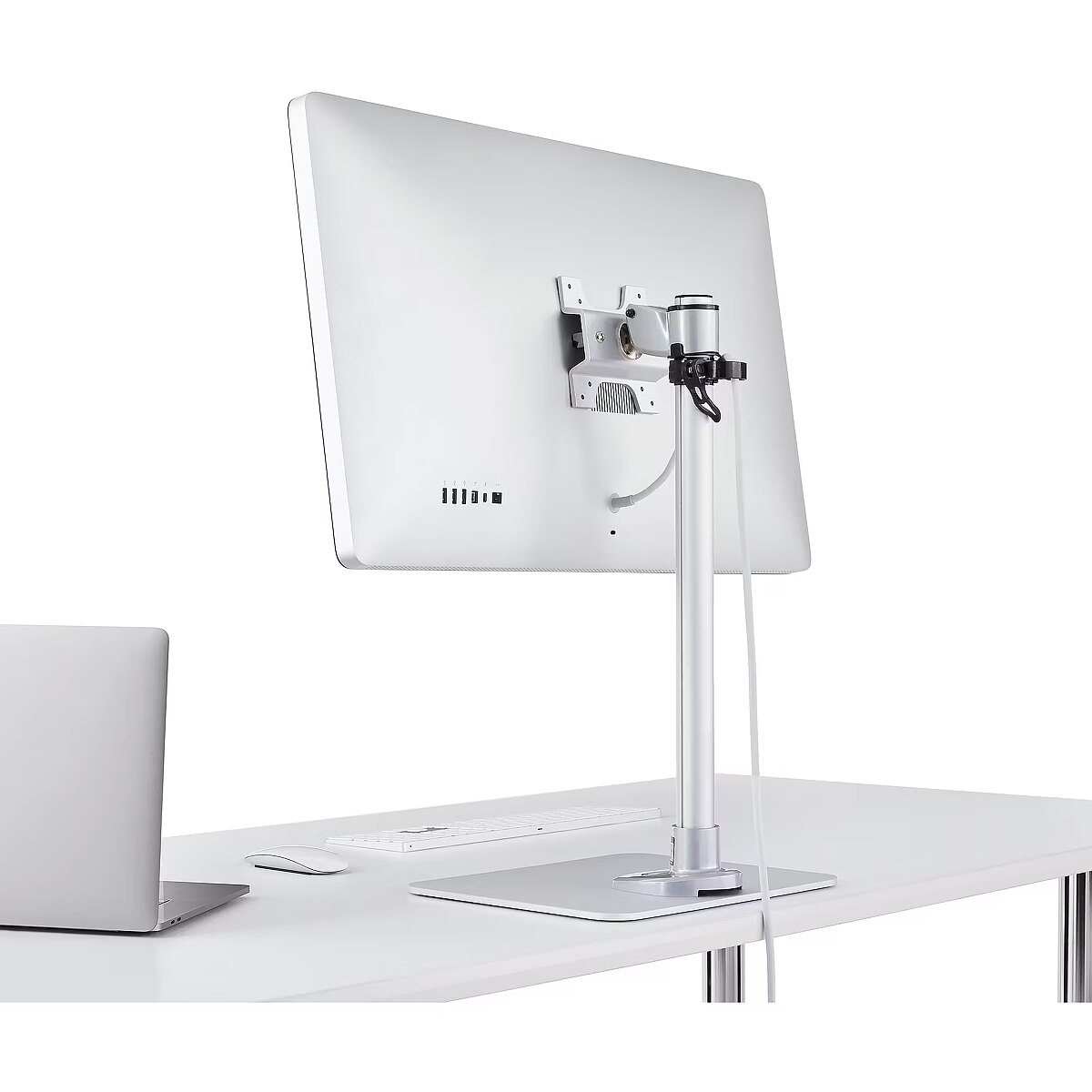 LongDesc - VESA Monitor Mount | Works with iMac / Apple Cinema / Thunderbolt Displays | Up to 34" MonitorsThis robust steel single monitor stand, with its sleek silver finish, provides secure support for your display and makes an attractive addition to your workspace. The monitor desk stand allows flexible placement of your computer screen, and is easily adjustable for ideal viewing.Versatile Use with Multiple MonitorsThe monitor mount holds your display with ease, supporting monitors from 12" to 34" up to a maximum weight capacity of 30 lb. (14kg). For added flexibility, you can use the included hardware to mount your Apple Cinema Display, Thunderbolt Display or Apple iMac. The stand works with any Apple Cinema Display or Thunderbolt Display that came with a removable stand or built-in VESA mount adapter. It also works with the 24-inch iMac and 27-inch iMac with a removable stand, or with a built-in VESA mount adapter.Work in ComfortThe monitor desk stand features a 15" (380 mm) tall support post, providing a wide range of height adjustment for greater comfort while you work. Adjust your display height, position and viewing angles easily to create an ergonomic work environment.Optimum ViewingThe adjustable monitor stand lets you mount a display on the desk stand, with tilt and swivel adjustments for ideal positioning. For viewing longer pages or blocks of code without scrolling, the desk monitor stand also supports landscape-to-portrait display rotation.Steel Construction and Easy SetupMade of durable steel, the single monitor mount provides easy set-up for a wide range of monitors. The integrated cable management helps to keep your cables organized and out of view.The TAA compliant ARMPIVSTND is backed by a StarTech.com 10-year warranty and free, lifetime technical support.The StarTech.com Advantage- Experience an ergonomic workspace, through simple display height, position and viewing angle adjustments- Maximize space efficiency by elevating your display above the desk surface