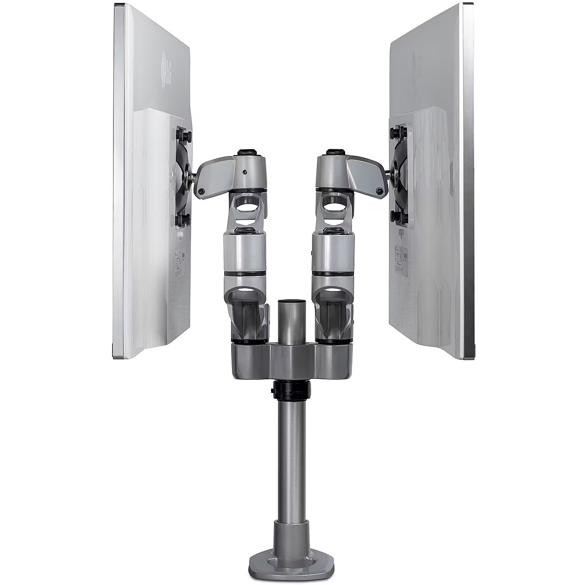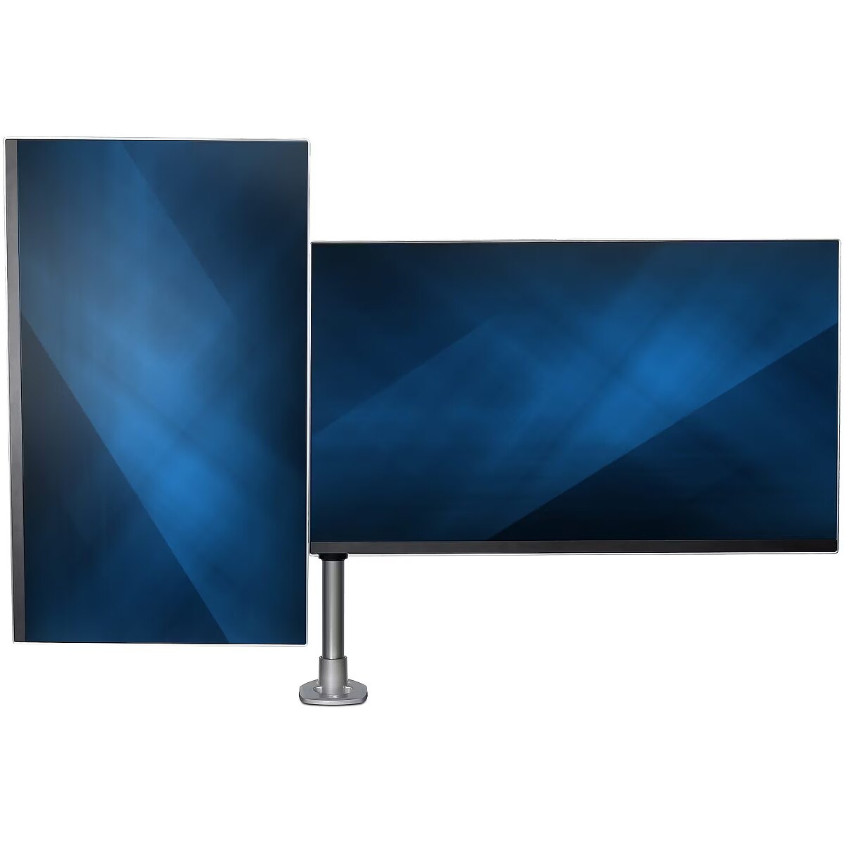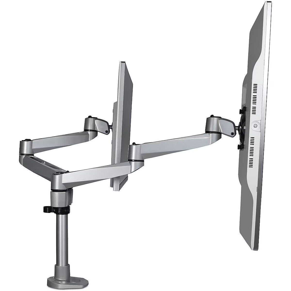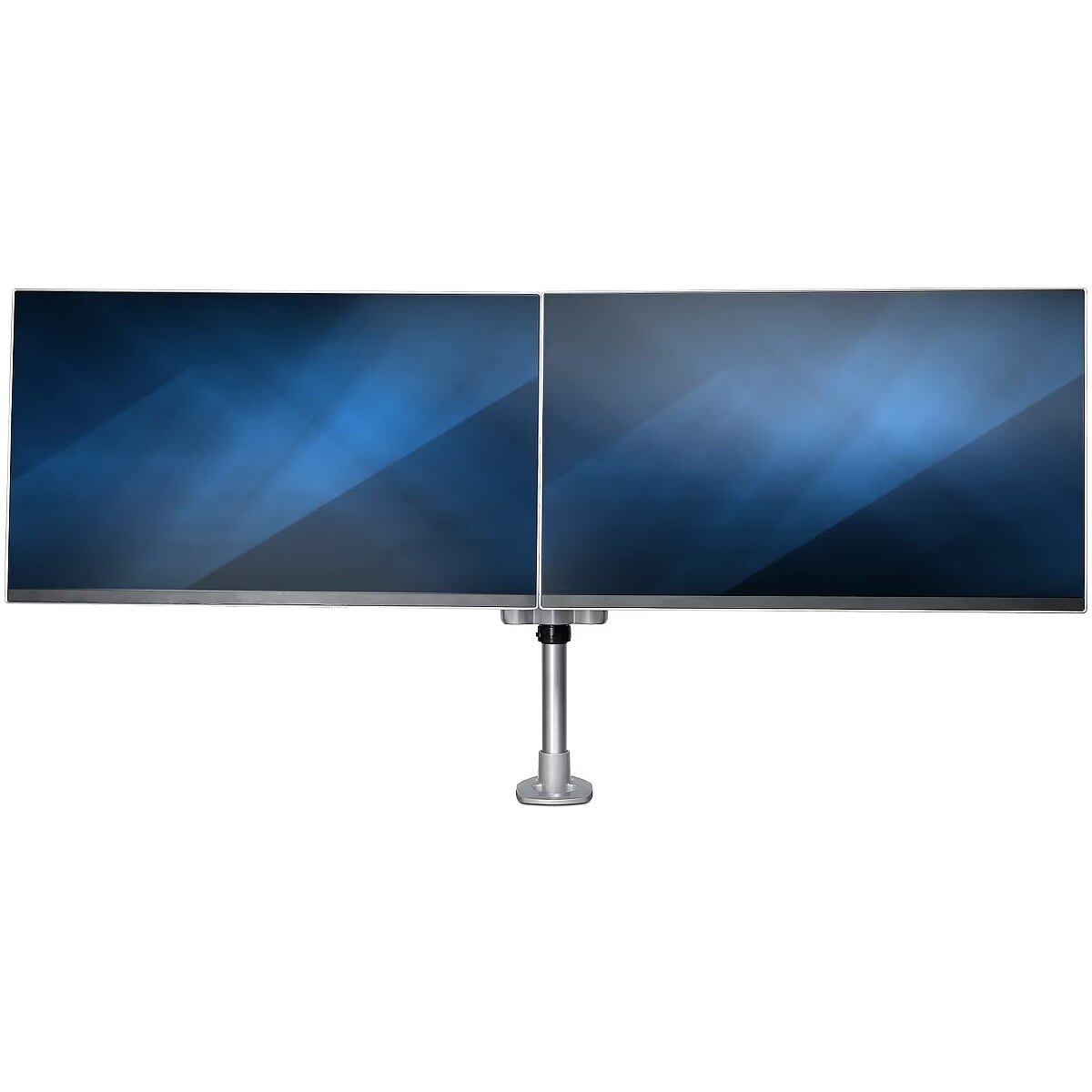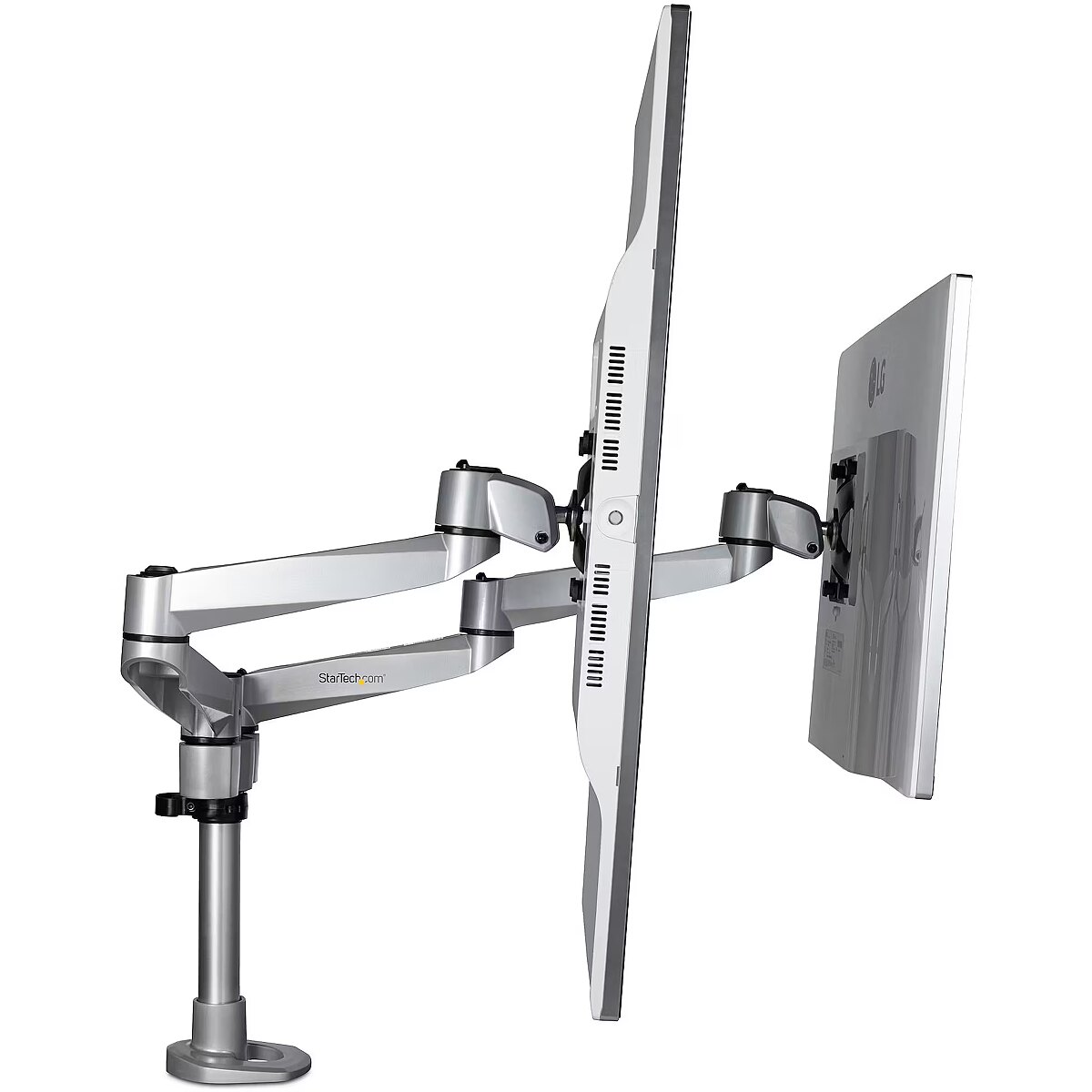 LongDesc - Monitor Mount | Desk/Grommet Mount | Tool-less Assembly | For up to 30" MonitorsCreate an ergonomic workspace with this premium desk-mount dual monitor arm, for monitors up to 30" each. The two articulating monitor arms with dual-swivel action offer a wide range of motion side to side. The attractive silver finish enhances the aesthetics of your workspace.Enjoy a Wide Range of Motion to Work in ComfortThe dual articulating monitor arms offer a wide range of motion on several axes. It provides effortless motion to adjust the position of your monitors.Sleek and Stable Aluminum DesignThe robust aluminum design provides stable support for your monitors. The computer-monitor desk mount supports two VESA mount monitors (75x75, 100x100) with a weight capacity of up to 22 lb. (10 kg) per display. The cable-management channel helps to keep your workstation neat and tidy.Adjust your Viewing AngleShare your screen with ease. The double monitor mount offers a full +180-degree / -180-degree pan, to move your screen left or right. It tilts freely +90 / -15 degrees to adjust the angle up or down. Rotate your screens for landscape or portrait viewing.Height AdjustmentWork in comfort. This height-adjustable monitor mount lets you raise or lower the monitor arms along the pole, with a range of up to 6.3" (160 mm)Tool-less AssemblyThe fully assembled desk clamp and pole, plus quick slide-and-click connections, ensure easy assembly. It also saves time when setting up multiple units. The dual-screen mount gives you the option of desk clamp or grommet hole mounting (hardware included).The TAA compliant ARMDUALPS is backed by a StarTech.com 10-year warranty and free lifetime technical support.The StarTech.com Advantage