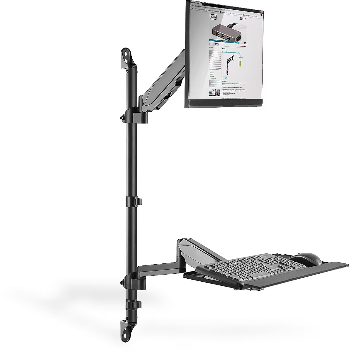 Description - Universal wall mount for mounting a monitor, keyboard / mouse and PC with flexible working height adjustment. Prepare a workplace that can accommodate multiple people's working height despite the difference in height thanks to the three quick steps. Two integrated gas springs make adjusting the height of the monitor and keyboard shelf child's play. The set includes a PC holder for wall mounting.