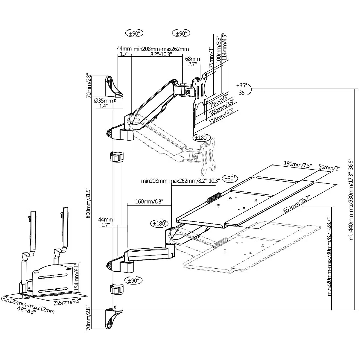Other features - Gas springs allow you to easily adjust the height of the monitor and keyboard Quick release feature - allows you to quickly attach or detach a monitor Complete with holder for PC Padded palm rest and mouse pad Free rotation adjustment up to 90 ° Freely adjustable vertical tilt angle up to 35 degrees The monitor can be rotated 360 ° Monitor load: max. 8 kg Keyboard load: max. 1 kg Load on the PC: max. 10 kg Built-in cable guide