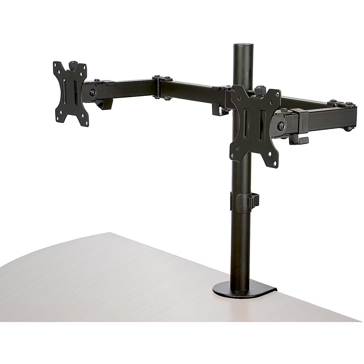 LongDesc - Monitor Mount | Desk/Grommet | Double Joint | Adjustable | For up to 32" MonitorsWork in comfort while saving space. This highly functional desk mount dual monitor arm brings you a cost-effective and versatile solution to an ergonomic workspace. Enjoy a wide range of motion with the double-jointed crossbar design plus tilt, swivel, rotation and height adjustment. Make your Workspace Work for YouThe multi monitor mount gives you the flexibility to set-up your desktop your way. Each of the articulating arms extends a full 15.7" (39.9 cm) to adjust to your needs. The flexible double joints on the arms give you numerous options to position your monitors. You can place your monitors to face you, or even turn your monitors right around, 180-degrees, to share your screen with others. If you choose, you can also tighten the joints, making your setup as stationary as you like.Crossbar Design Made of SteelThe cross-bar design provides a clean and simple look, while keeping monitors aligned. Use the micro-adjustment knob to align your monitors perfectly.Made of steel, the rugged two display arm securely supports two VESA mount (75x75, 100x100) monitors up to 32", with a weight capacity of 17.6 lb. (8 kg) per monitor.Find the Ideal Viewing AngleThe double monitor arm lets you smoothly and effortlessly adjust the position of your screens for optimum viewing. Tilt your monitors +45/-45 degrees. Swivel +90/-90 degrees to the left or right. Rotate your monitors to portrait or landscape position with the 360-degree rotary VESA plate.Height AdjustableAdjust your monitors to the desired height. The dual screen mount is height adjustable along the 17.4" (44.3 cm) pole.Easy to InstallThe multiple monitor mount is easy to install, using the C-clamp to attach the mount to the edge of your desk, table, or counter or mounting it through a grommet hole. The detachable VESA plate makes it easy to attach or remove your monitor. The built-in cable management keeps your cables neatly tucked away. ARMDUAL2 is backed by a StarTech.com 5-year warranty and free, lifetime technical support. The StarTech.com Advantage- 32 INCH LARGE MONITOR SUPPORT: VESA 75x75mm / 100x100mm compatible multi monitor mount supports 2 large monitors up to 32" (17.6 lb / 8 kg) per arm w/ horizontal articulation & basic height adjustment- WIDE RANGE OF MOTION: Double monitor mount increases ergonomic comfort and productivity with +45/-45° tilt, +90/-90° swivel, 360° rotating display, and adjustable height along the 15.7" (39.8 cm) pole- ADJUSTABLE SET UP: Use the desk-clamp (C-clamp) or grommet mount to easily mount and tighten by hand to a desktop & cable management clips can hold incl. tools for quick height & angle adjustment