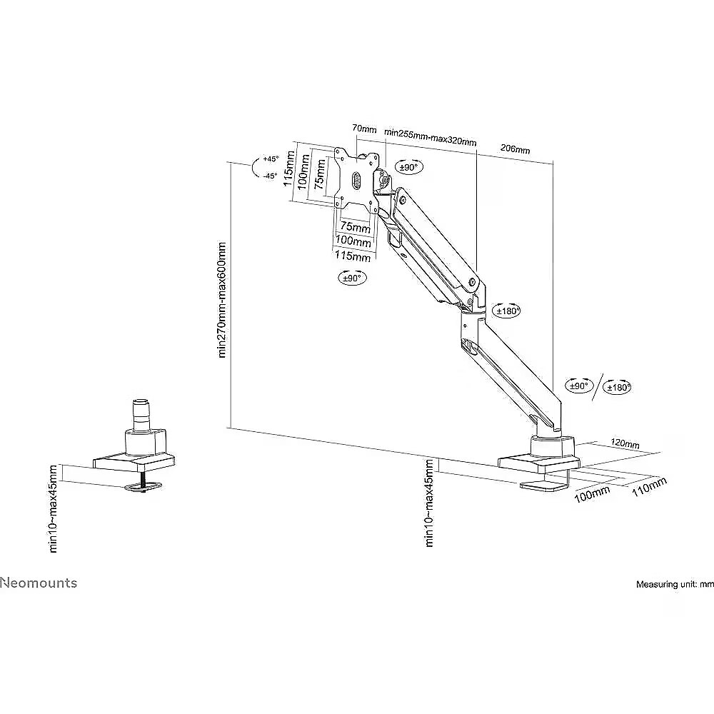 LongSummaryDescription - Neomounts NM-D775BLACKPLUS Monitor arm 10-49" - gas spring - Topfix - 180°-stop. Mounting: Clamp/Grommet, Maximum weight capacity: 18 kg, Minimum screen size: 25.4 cm (10"), Maximum screen size: 124.5 cm (49"), Minimum VESA mount: 75 x 75 mm, Maximum VESA mount: 100 x 100 mm. Height adjustment, Swivel angle range: 0 - 360°, Tilt angle range: -45 - 45°. Product colour: Black